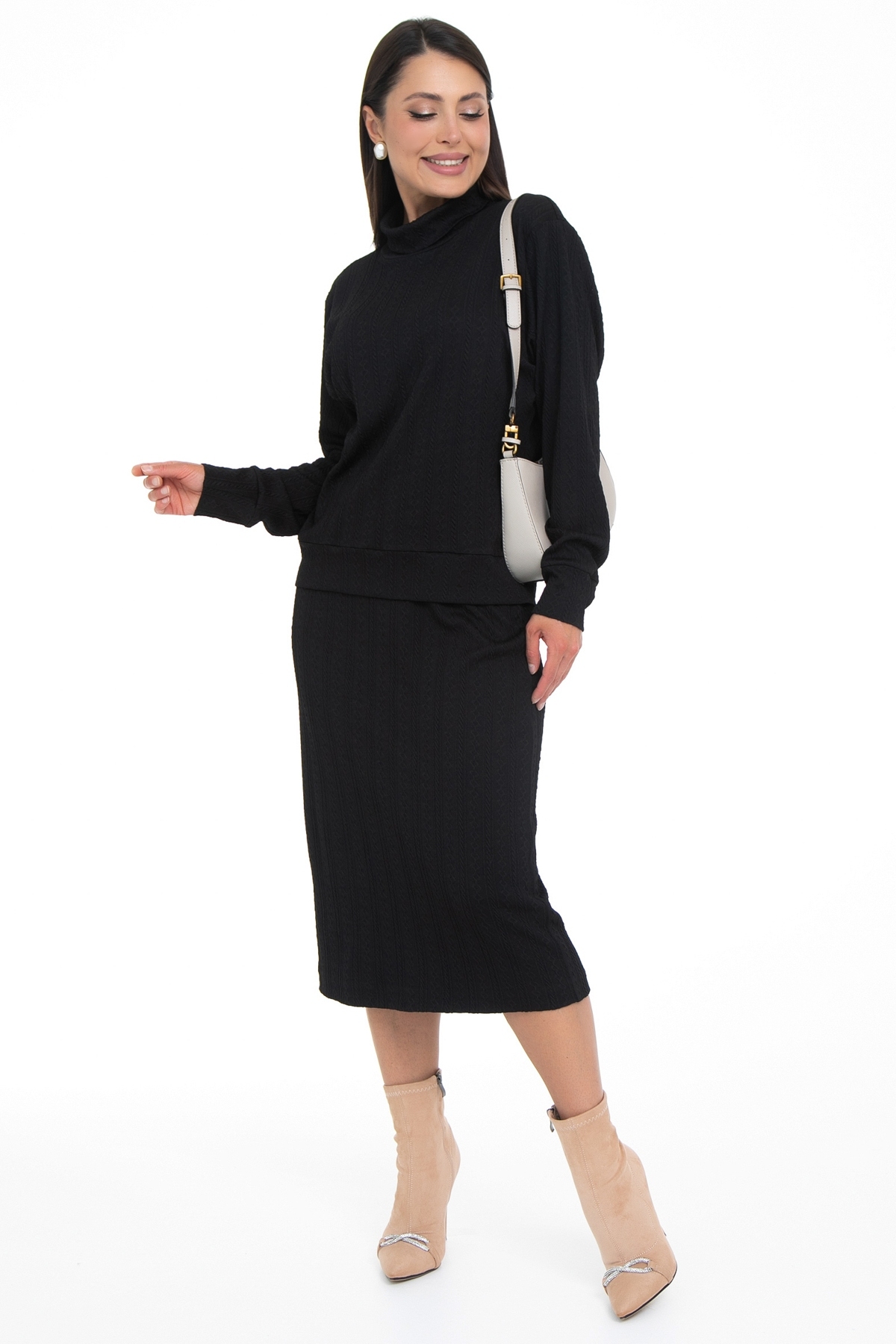 Трикотажный костюм с юбкой состоящий из кофты свитшота и прямой юбки длины миди идеально подойдет как офисный, деловой, нарядный, праздничный, а так же повседневный костюм! Костюм двойка выполнен из качественной ткани трикотаж- вискоза и эластан в составе обеспечивают хорошую посадку на фигуре, интересный узор добавляет текстурности. Костюм имеет свободный силуэт, очень удобный и комфортный, не сковывающий движения, но в тоже время стильный и модный. Юбка на мягком поясе с резинкой внутри, на трикотажной подкладе по всей длине, благодаря чему юбка совсем не просвечивает. Комплект с юбкой- это всегда множество образов в разных стилях, поскольку можно носить каждый элемент сочетая с другой одеждой!