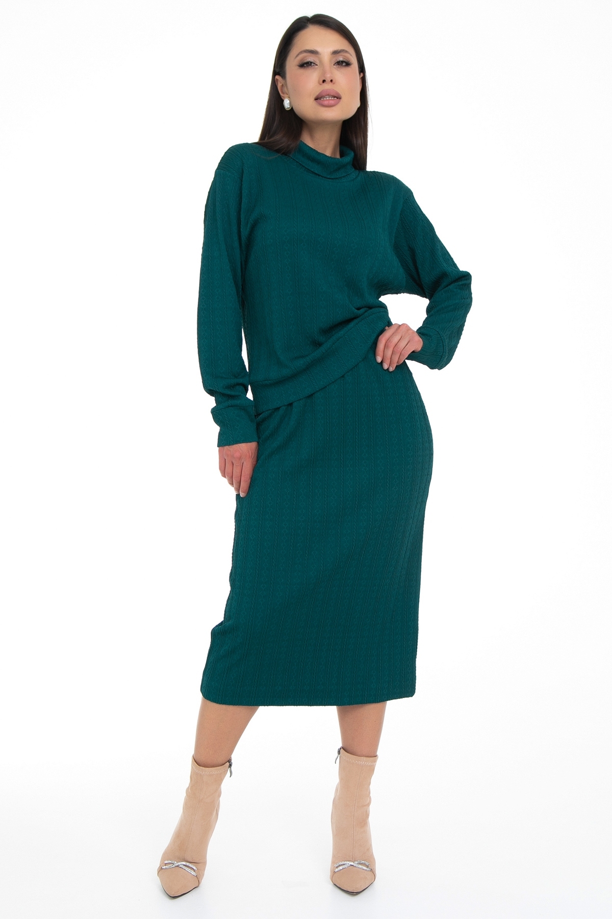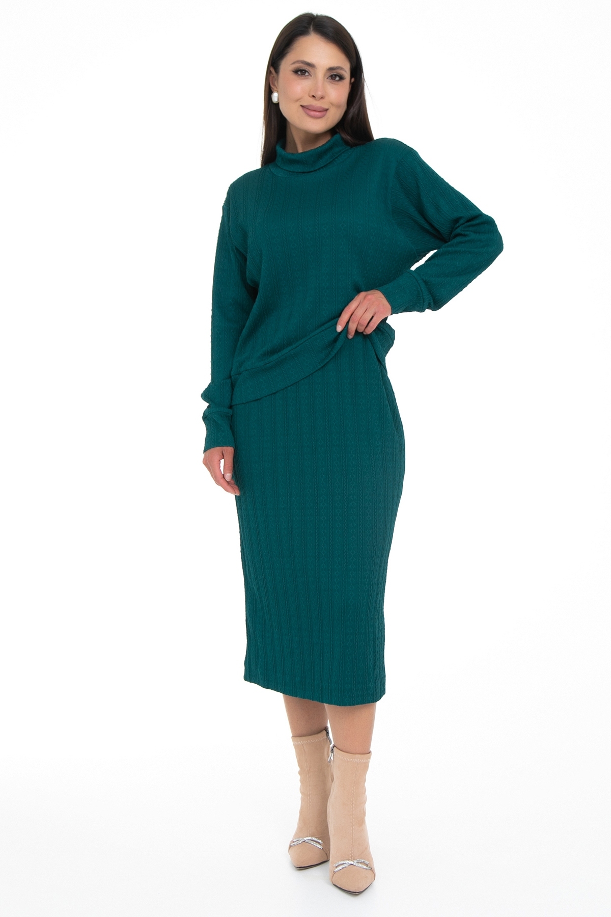 Трикотажный костюм с юбкой состоящий из кофты свитшота и прямой юбки длины миди идеально подойдет как офисный, деловой, нарядный, праздничный, а так же повседневный костюм! Костюм двойка выполнен из качественной ткани трикотаж- вискоза и эластан в составе обеспечивают хорошую посадку на фигуре, интересный узор добавляет текстурности. Костюм имеет свободный силуэт, очень удобный и комфортный, не сковывающий движения, но в тоже время стильный и модный. Юбка на мягком поясе с резинкой внутри, на трикотажной подкладе по всей длине, благодаря чему юбка совсем не просвечивает. Комплект с юбкой- это всегда множество образов в разных стилях, поскольку можно носить каждый элемент сочетая с другой одеждой!