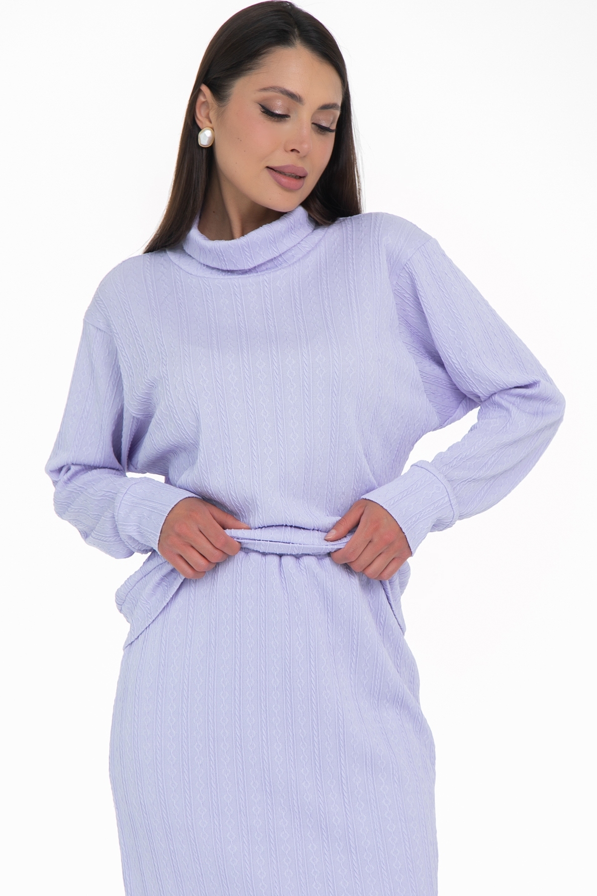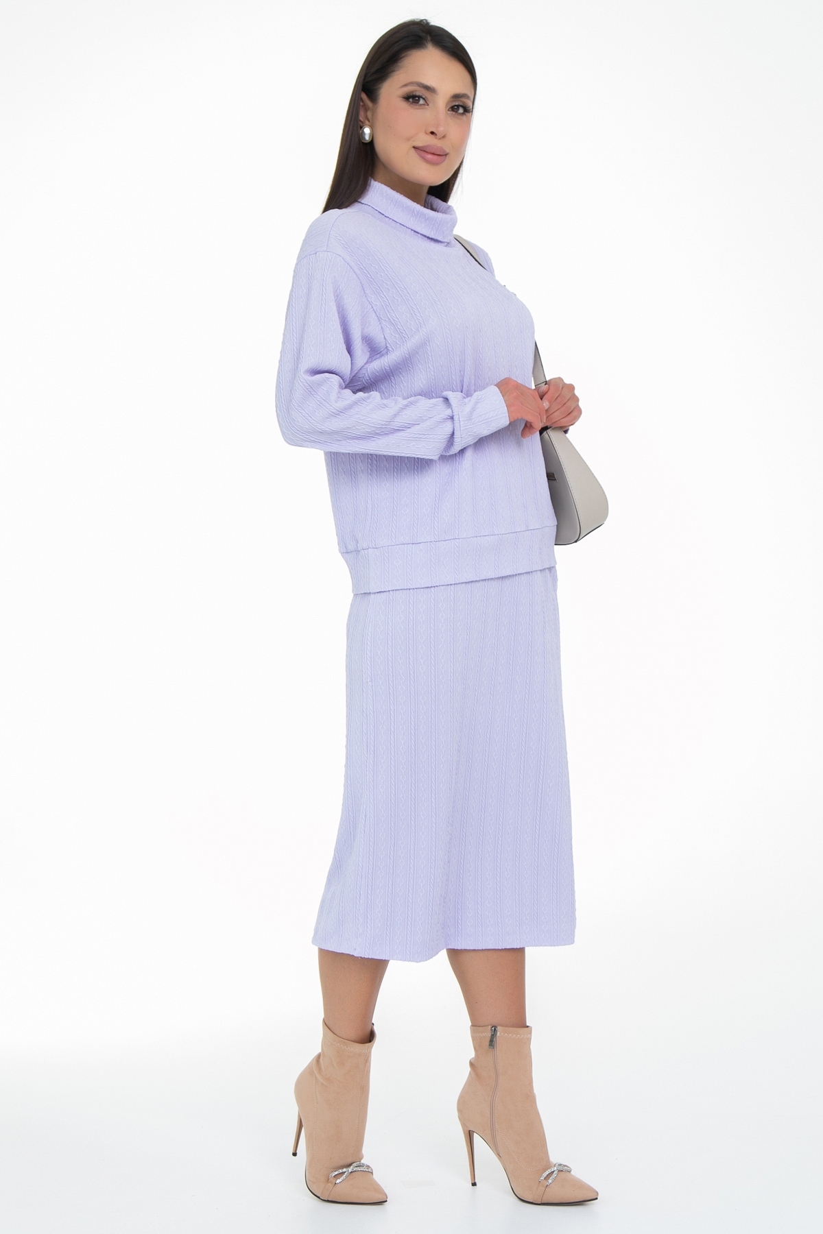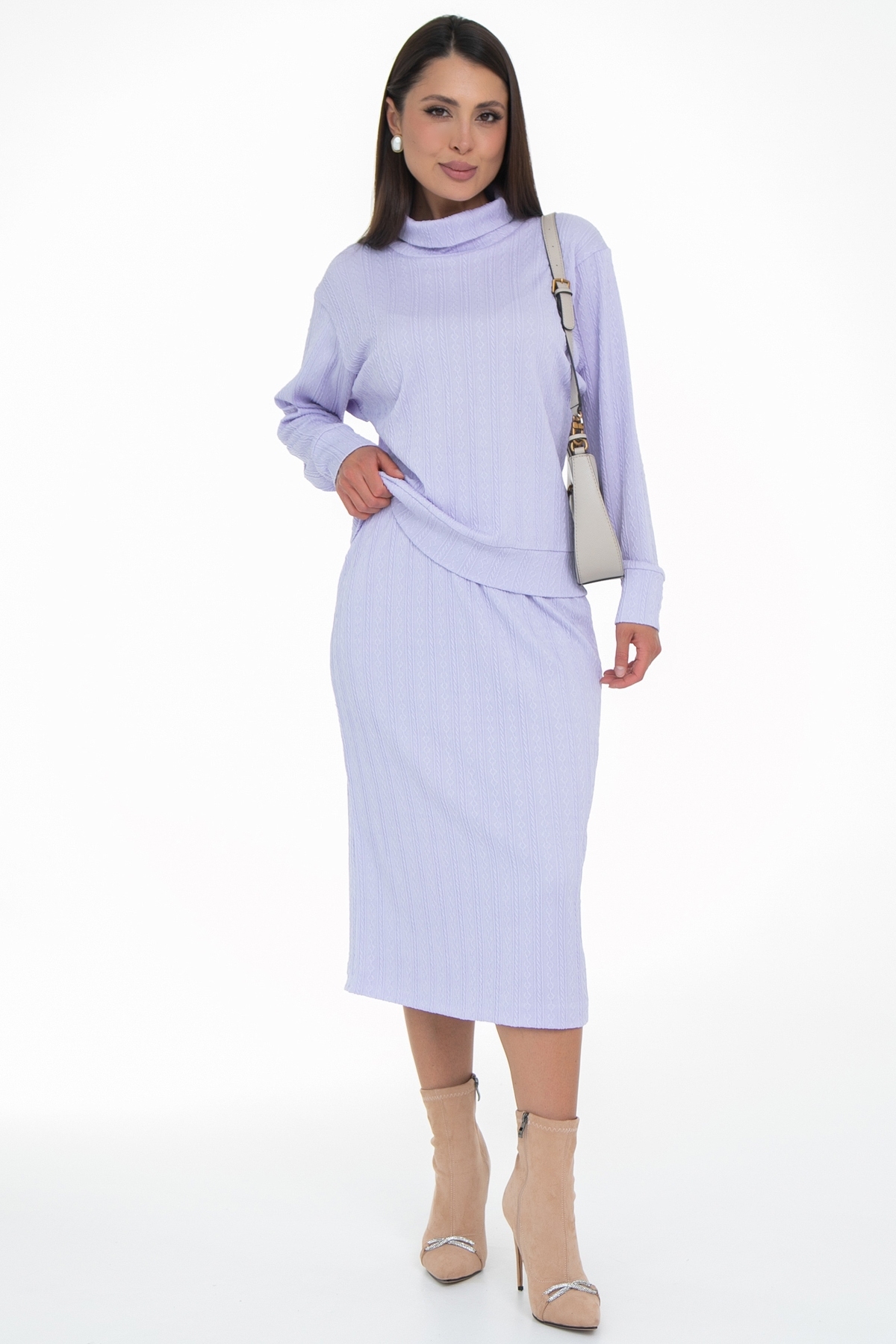 Трикотажный костюм с юбкой состоящий из кофты свитшота и прямой юбки длины миди идеально подойдет как офисный, деловой, нарядный, праздничный, а так же повседневный костюм! Костюм двойка выполнен из качественной ткани трикотаж- вискоза и эластан в составе обеспечивают хорошую посадку на фигуре, интересный узор добавляет текстурности. Костюм имеет свободный силуэт, очень удобный и комфортный, не сковывающий движения, но в тоже время стильный и модный. Юбка на мягком поясе с резинкой внутри, на трикотажной подкладе по всей длине, благодаря чему юбка совсем не просвечивает. Комплект с юбкой- это всегда множество образов в разных стилях, поскольку можно носить каждый элемент сочетая с другой одеждой!