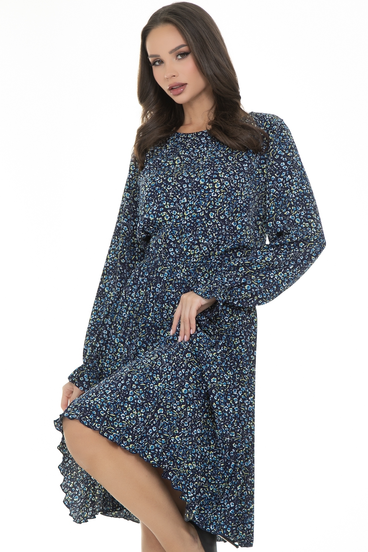 Элегантное платье свободного облегания с невероятно популярной в этом сезоне юбкой гофре. Отлично подойдет на любую фигуру. Красивый пышный рукав с воланом придает очарование образу. Платье отрезное по талии и по шву собрано на резинку. Горловина обработана обтачкой. От плеча на грудь заложены по две складки с каждой стороны. Рукава втачные длинные на резинке, по низу рукава волан.