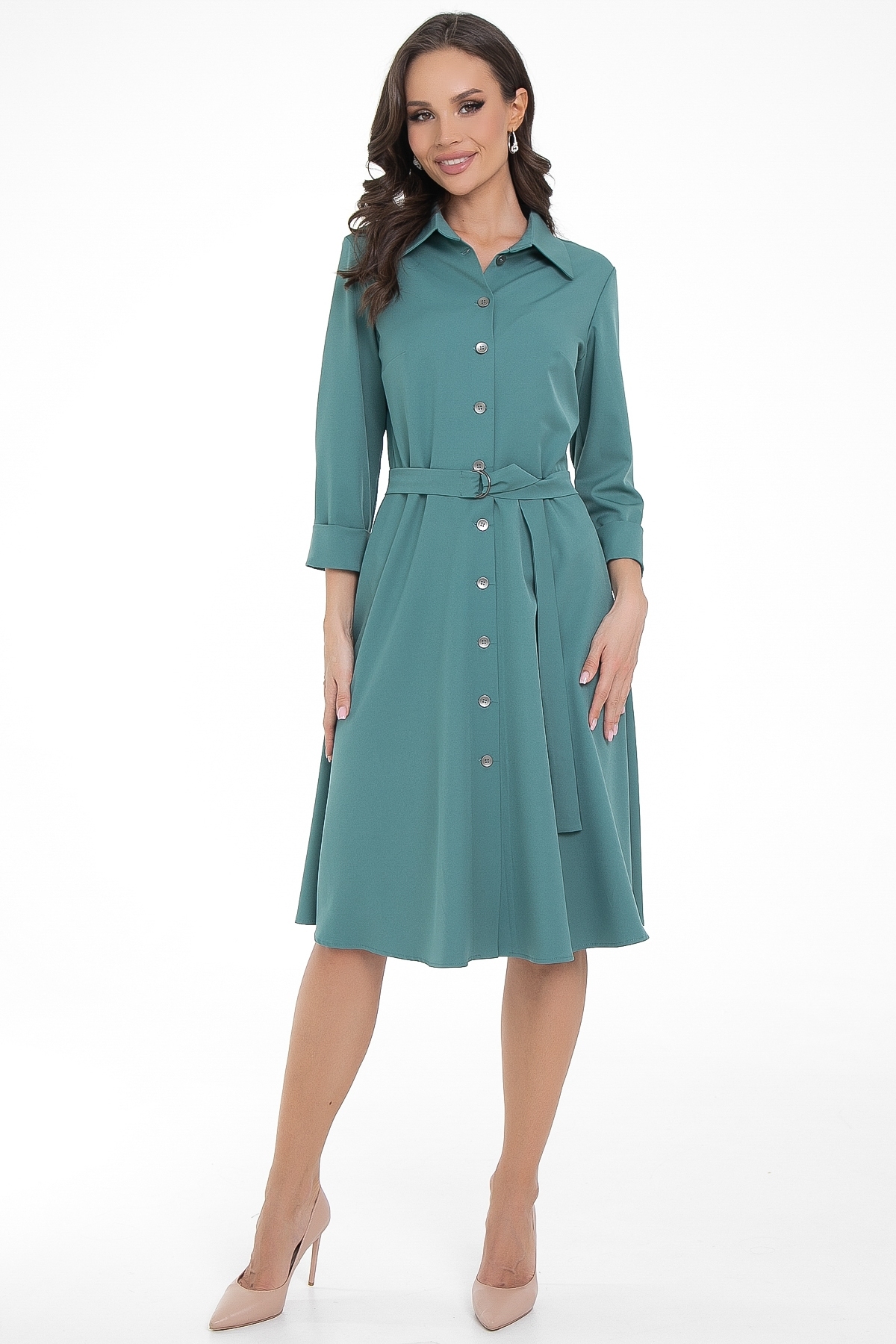 Уникальный дизайн, удобство и универсальность делают его идеальным выбором для создания разнообразных образов. Подарите себе безупречный и модный наряд! Длина миди и классический рубашечный воротник делают его идеальным офисным платьем. В комплекте есть пояс, который делает силуэт более облегающим, приталенным и выгодно подчеркивает достоинства вашей фигуры. Классическое элегантное платье миди выполнено из очень приятной легкой и мягкой ткани, в состав которой входит вискоза и полиэстер. Добавление полиэстера придает ткани прочность и делает менее сминаемой, а вискоза придает комфорт и шелковистость. Спереди застегивается на пуговицы, по горловине сделан воротничок на стойке. Платье отрезное по линии талии, юбка А-силуэта. Рукав свободный 3/4. Платье дополняется поясом из основной ткани.