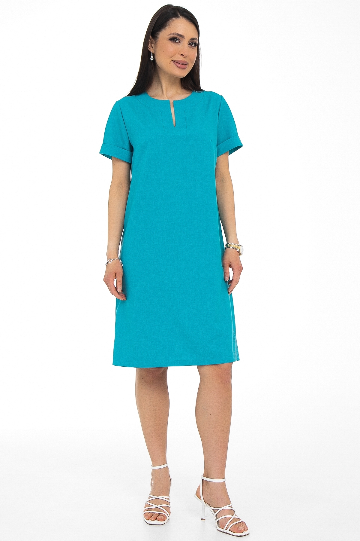 Обаятельное платье для Ваших побед при любых обстоятельствах. Платье А-силуэта, свободного прилегания, сядет на любую фигуру.  По горловине спереди сделана двойная фигурная кокетка. Сзади горловина обработана обтачкой. По переду сделаны вытачки на грудь. Рукав короткий, втачной с манжетом, подогнутым вверх. Спинка со средним швом, в который заложена небольшая вытачка приталивания. Модель выполнена из костюмно-плательной ткани "под лён".