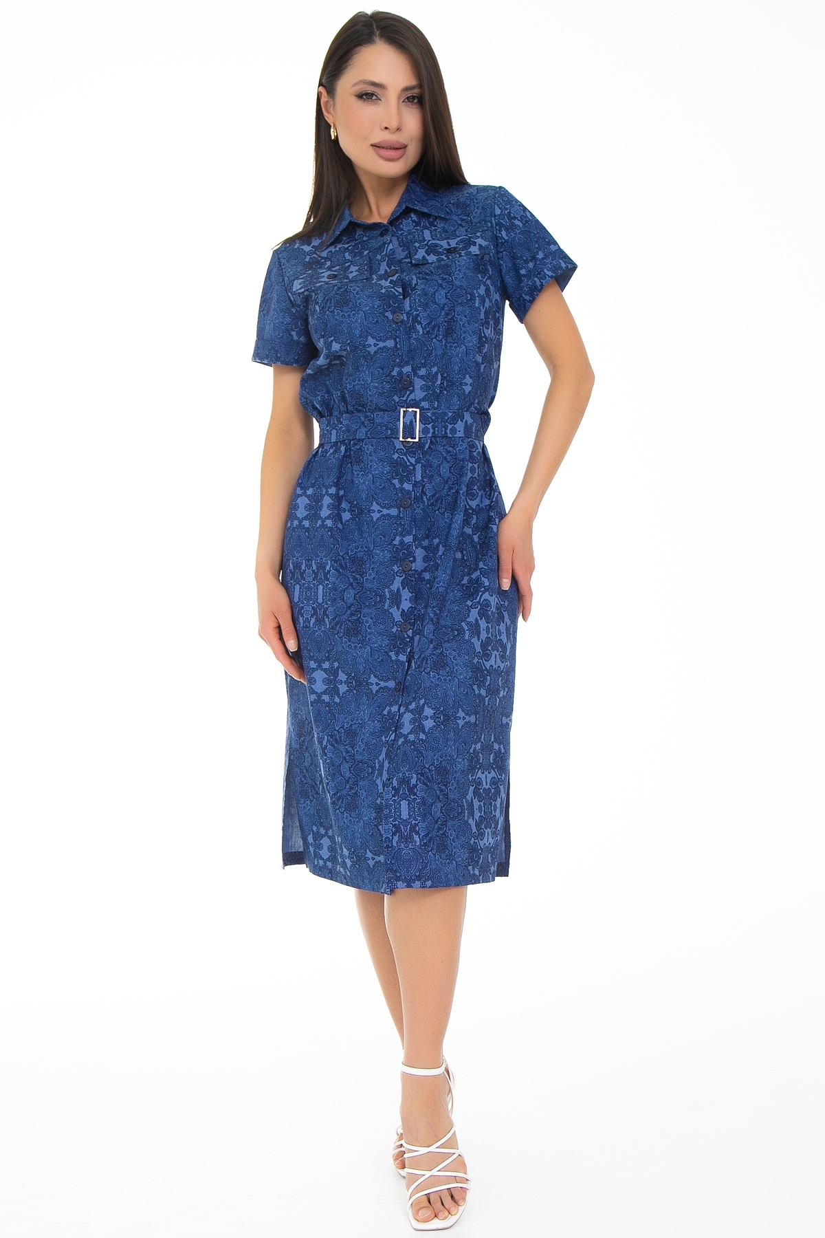 Летнее платье из лёгкой натуральной дышащей ткани "деним", с оригинальным модным принтом, станет любимым этим летом. Создайте неповторимый образ, который точно запомнится надолго. Платье застёгивается спереди на петли-пуговицы. Воротничок на стойке, по переду сделаны вытачки на грудь. По спинке сделаны две вытачки приталивания. Рукав короткий, втачной, с манжетом. В области талии и бёдер свободного прилегания. Платье дополняется поясом из основной ткани с красивой пряжкой.