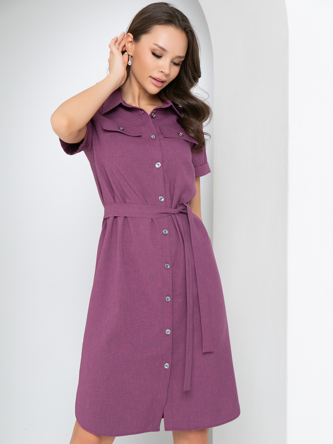 Платье удивительного цвета, который позволяет сочетать себя с самыми интересными оттенками. Экспериментируйте, наслаждайтесь. Платье-рубашка из вискозной ткани дарит высший уровень комфорта. Воротничок на стойке, по переду сделаны вытачки на грудь. Платье застёгивается спереди на петли-пуговицы, декорировано клапанами с пуговичкой. По спинке сделаны две вытачки приталивания. Рукав втачной, короткий, с манжетом. В области талии и бёдер свободного прилегания. Дополняется поясом из основной ткани.