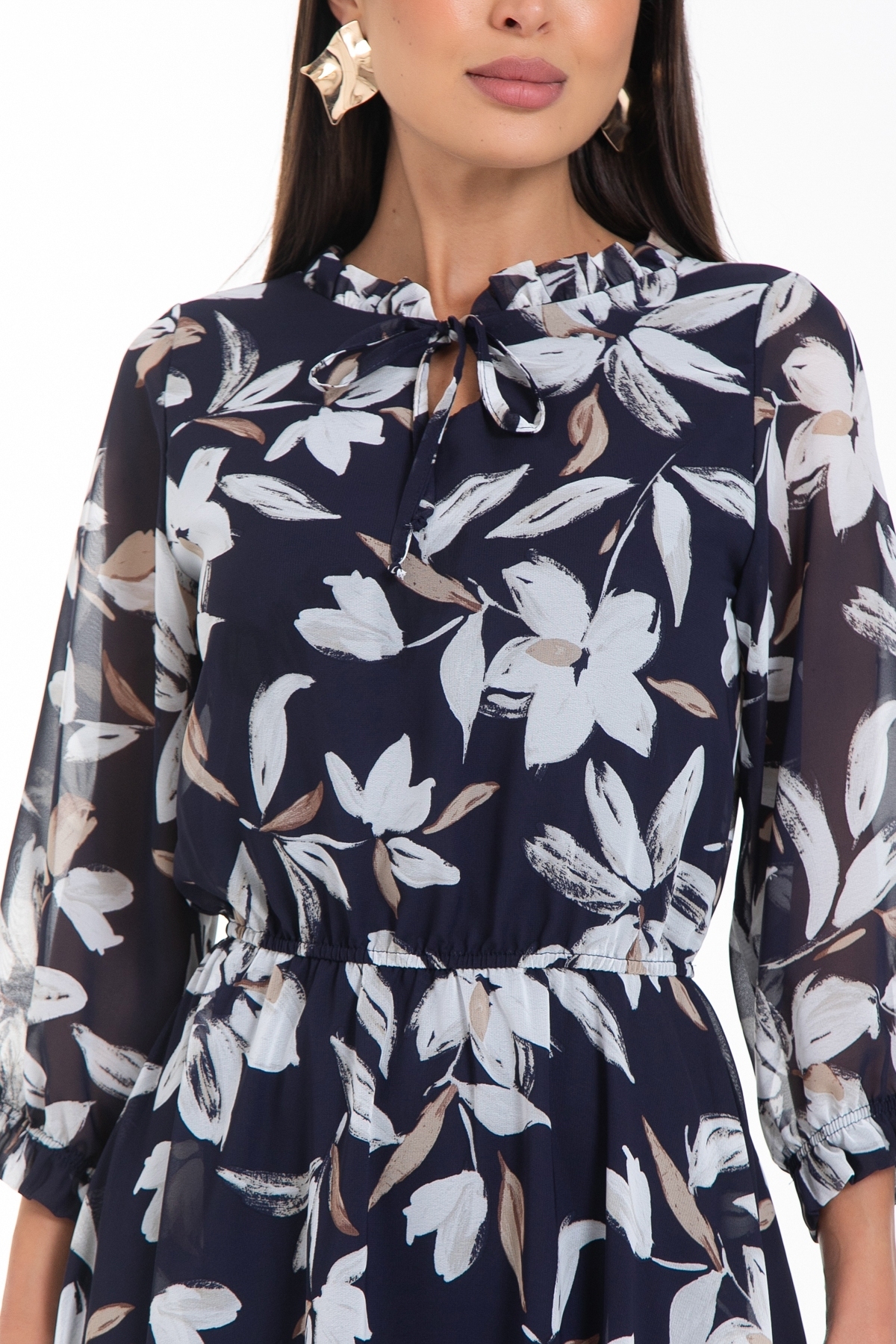 Летящее шифоновое платье подчёркивает достоинства вашей фигуры, делает Ваш образ женственным и нежным. Юбка платья полусолнце отрезная по линии талии. Полупрозрачные втачные рукава длиной 3/4 с низу подогнуты и сосборены на резинку. Платье с подкладом,притачным по горловине и пройме.По талии платье присборено на шпульную резину. Модель выполнена из шифона и трикотажного подклада.