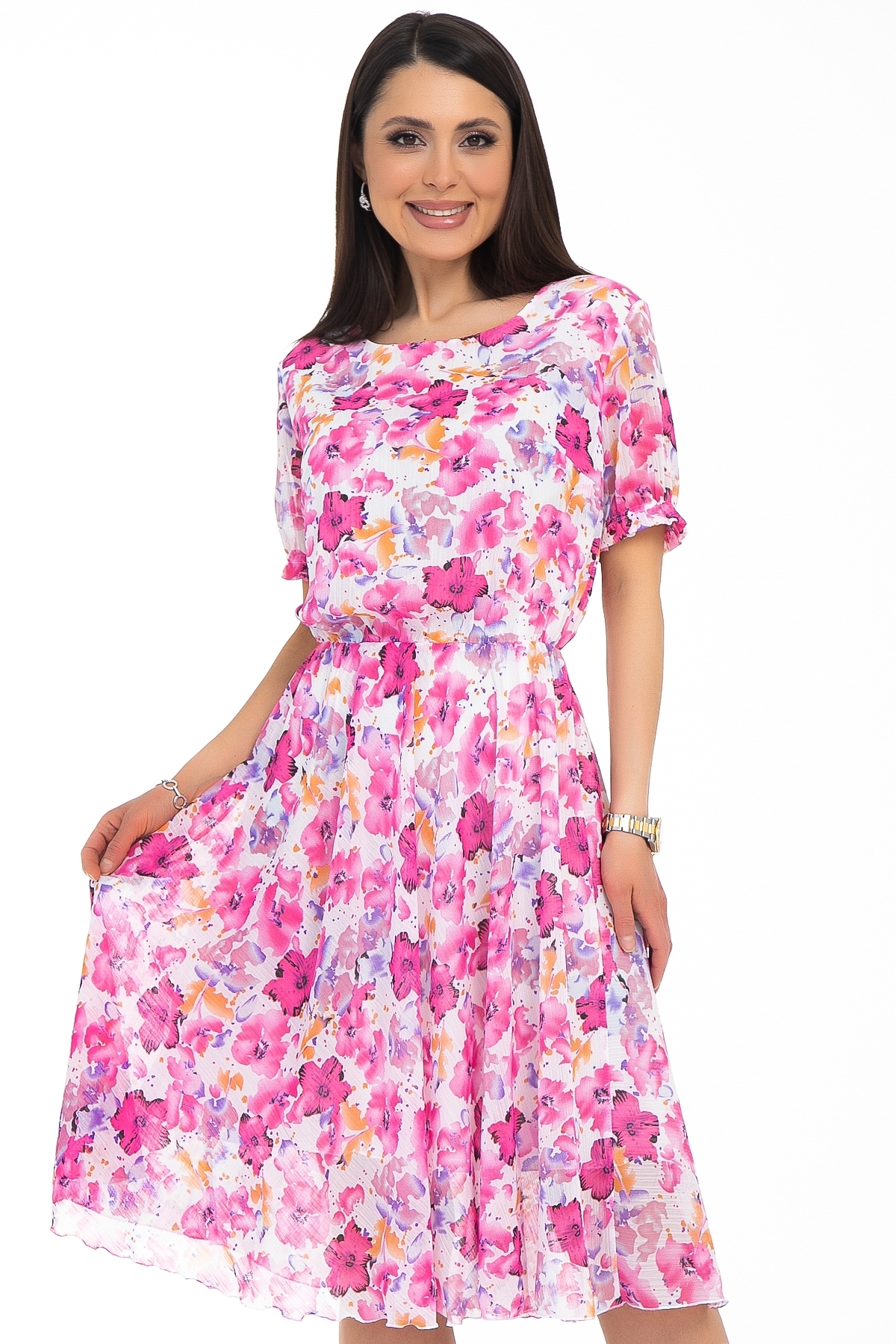 Если вы ищете что-то красивое и нарядное для лета или демисезонной поры, обратите внимание на наше шифоновое платье миди. Дизайнерское платье Diolche будет отличным выбором! Легкое и воздушное, оно сделано из шифона, украшено цветочным принтом и дарит летнее настроение уже ранней весной. Платье отрезное по линии талии. На талии собрано на резинку, круглая горловина обтачана трикотажным подкладом. Рукава короткие, втачные.