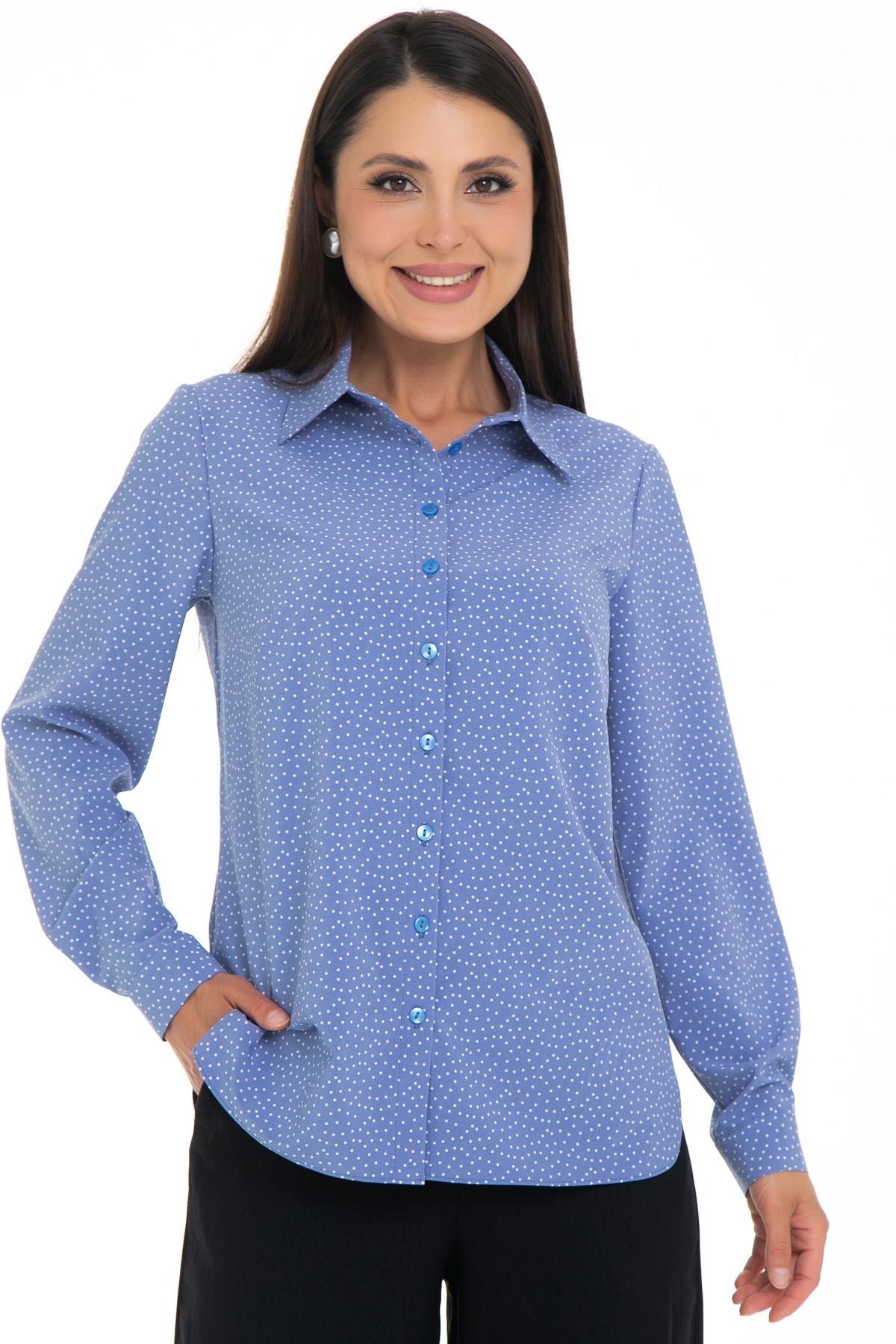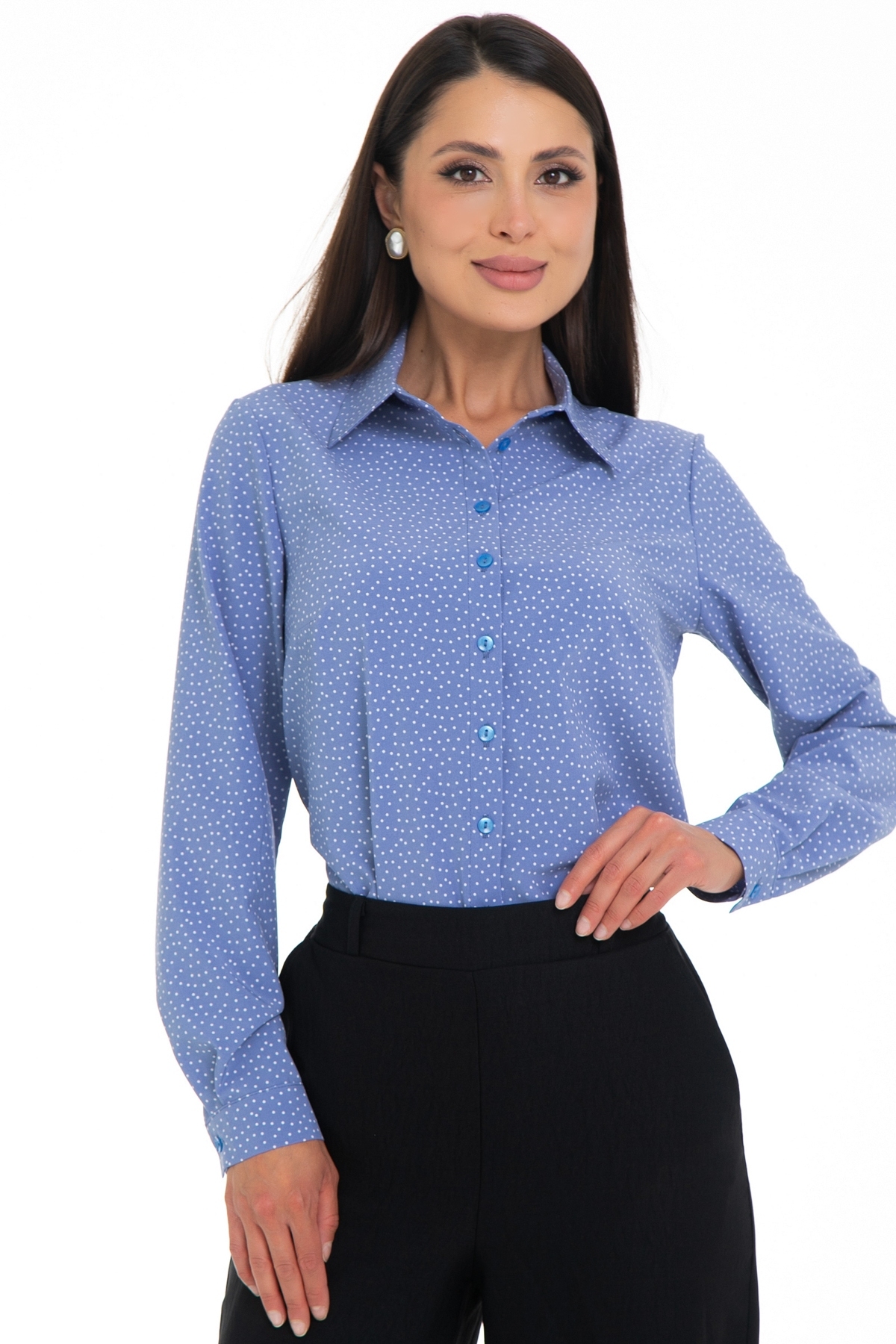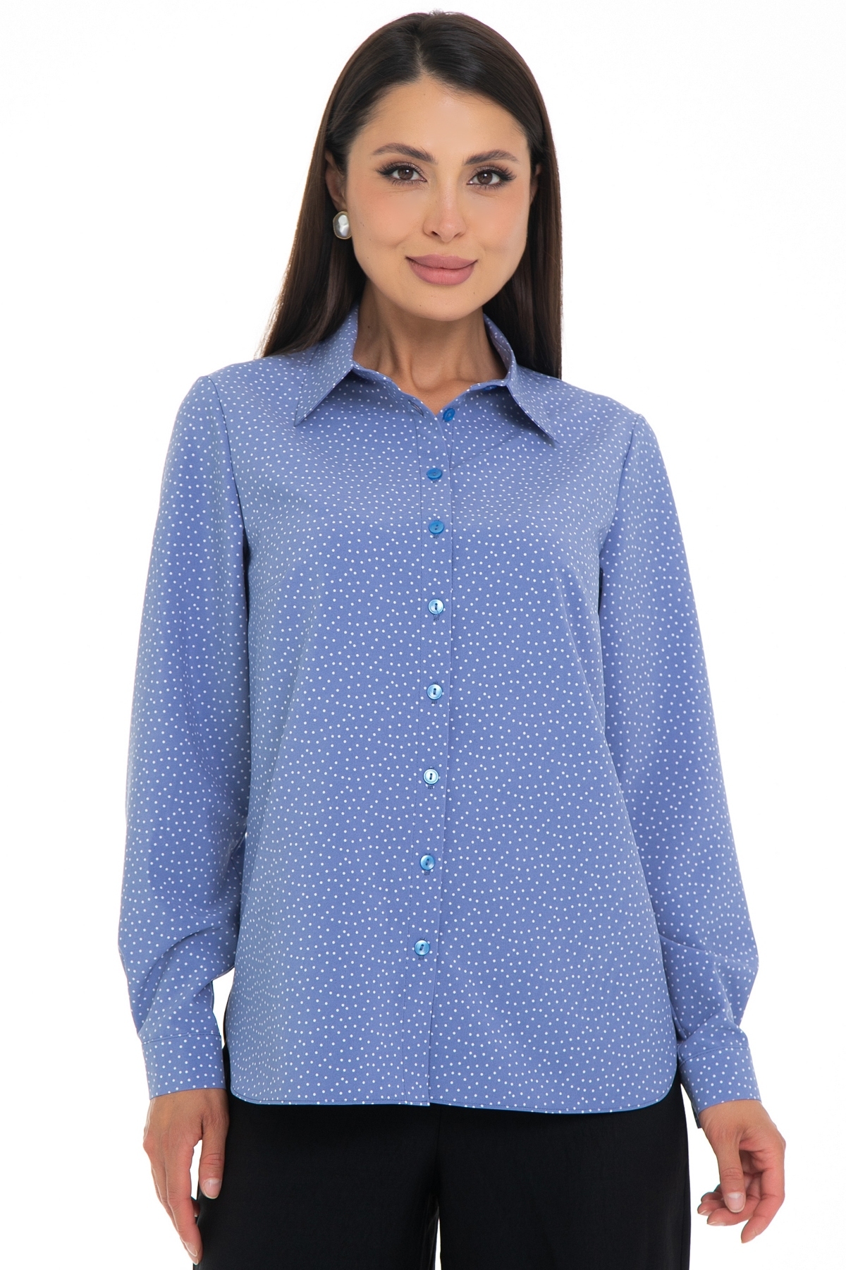 Возвращение любимой модели от Diolche. Блузка продуманного и универсального фасона, идеально подходящего под любой низ. Можно носить как с классическими брюками и юбками, так и с джинсами или под сарафан. Прекрасно смотрится как в заправленном состоянии, так и на выпуск. Классическая, немного приталенная рубашка с воротничком на стойке. Застёгивается спереди на пуговицы. Рукав втачной длинный на манжете. Спереди по бокам сделаны вытачки на грудь. По спинке сделаны вытачки в области талии. Удобная, комфортная вещь на все случаи жизни! Блузочная комфортная ткань, безупречная посадка!