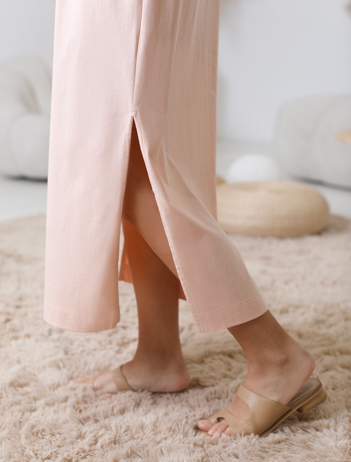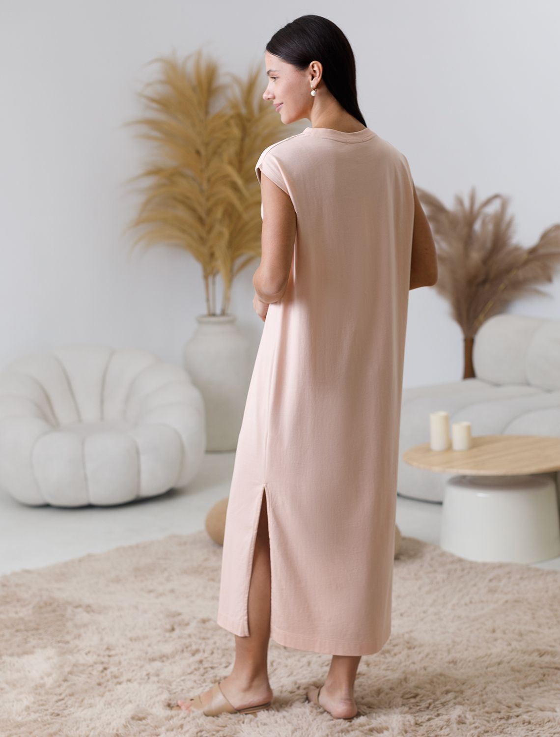 Стильное базовое платье пудрового цвета длины макси выполнено из 100% хлопка плотностью 140 Г/м2. Главная особенность этого изделия — тонкое кулирное полотно, которое легче и воздушнее стандартного трикотажа. Благодаря своей деликатной текстуре модель идеально подходит для домашних образов и пижамных комплектов. Ткань отлично «дышит», обеспечивая максимальный уют во время сна и отдыха. Свободный и прямой крой не сковывает движений и легко скроет возможные недостатки фигуры., а разрезы добавляют легкости и непринужденности образу. Короткий цельнокроеный рукав и позволяет чувствовать себя удобно в теплую погоду, а так же в домашней обстановке. Простота кроя сочетается с современным дизайном, создавая гармоничный лук без излишеств. Это легкое платье подойдет для тех, кто ценит комфорт и элегантность одновременно.