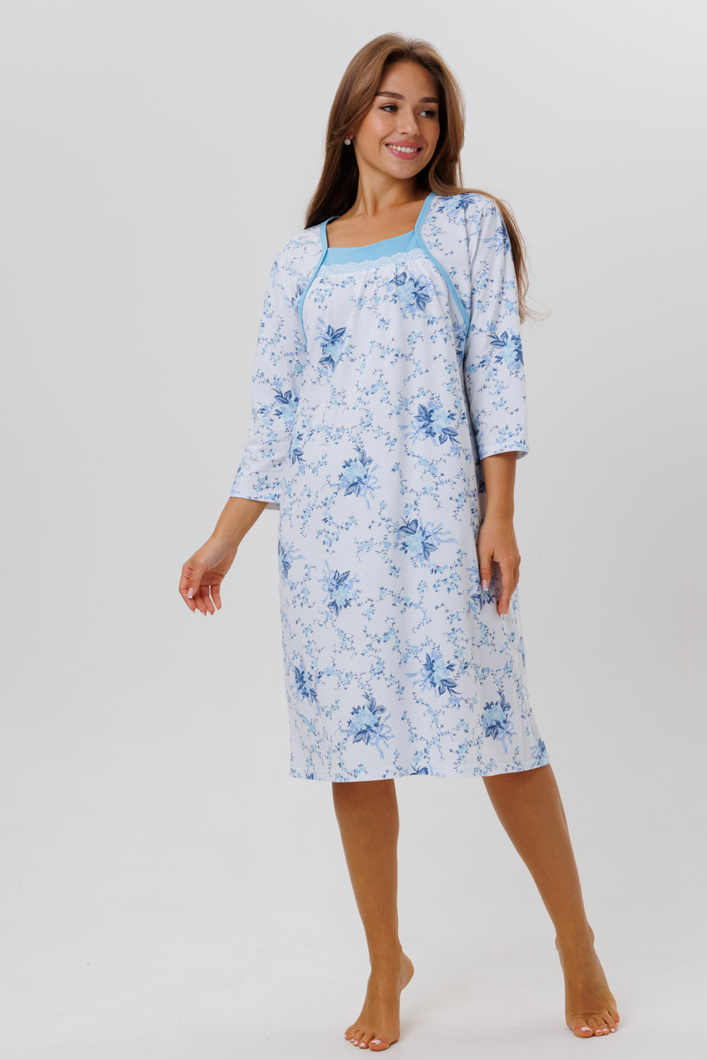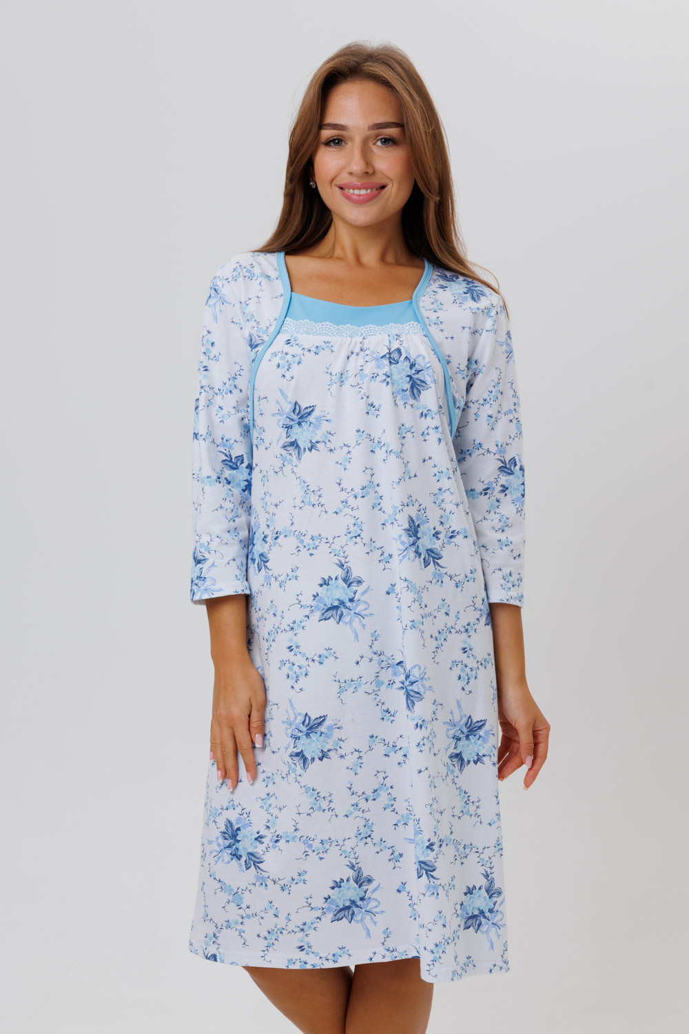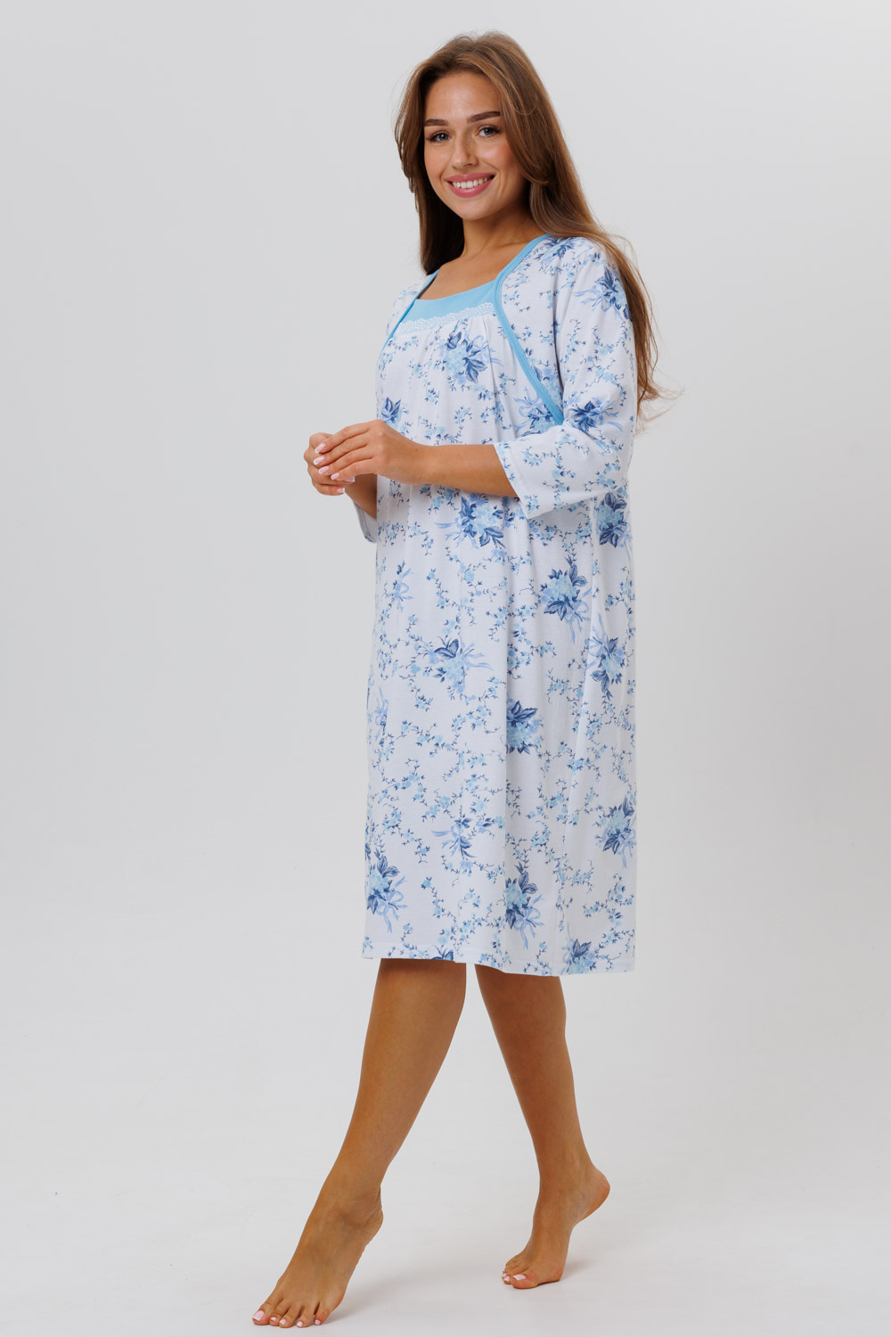 Уютная ночная сорочка из кулирки, длиной ниже колена, рукав длиной три четверти. Шов  притачивания кокетки к полочке обработан окантовкой из ткани-компаньона. Зона декольте украшена кружевом.