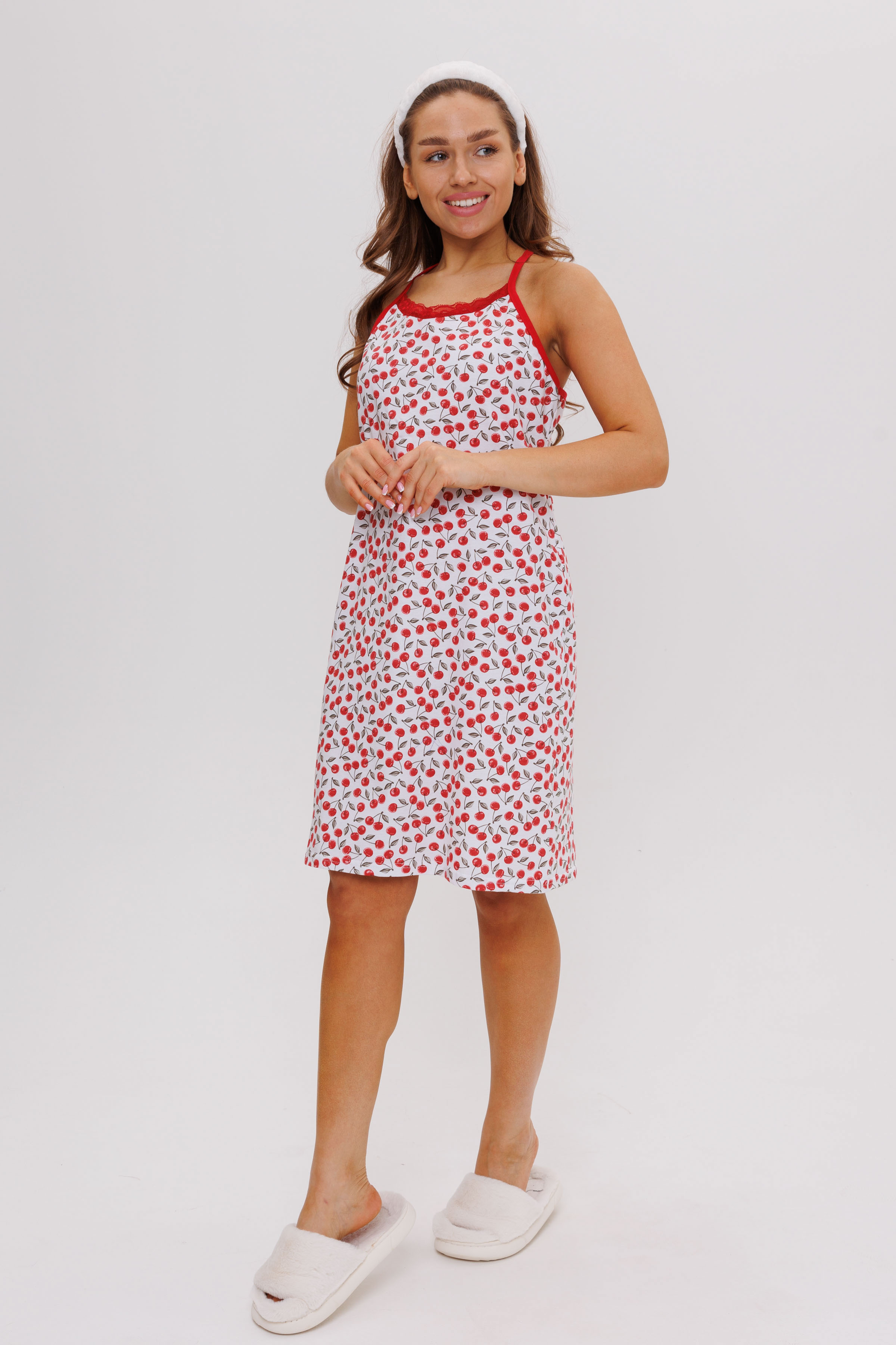 Нежная ночная сорочка из кулирки на лямках. Зауженный верх спики для более открытого выреза по плечам. Отделка кружевом по горловине. Окантовка из отделочной ткани. Длина - по колено.