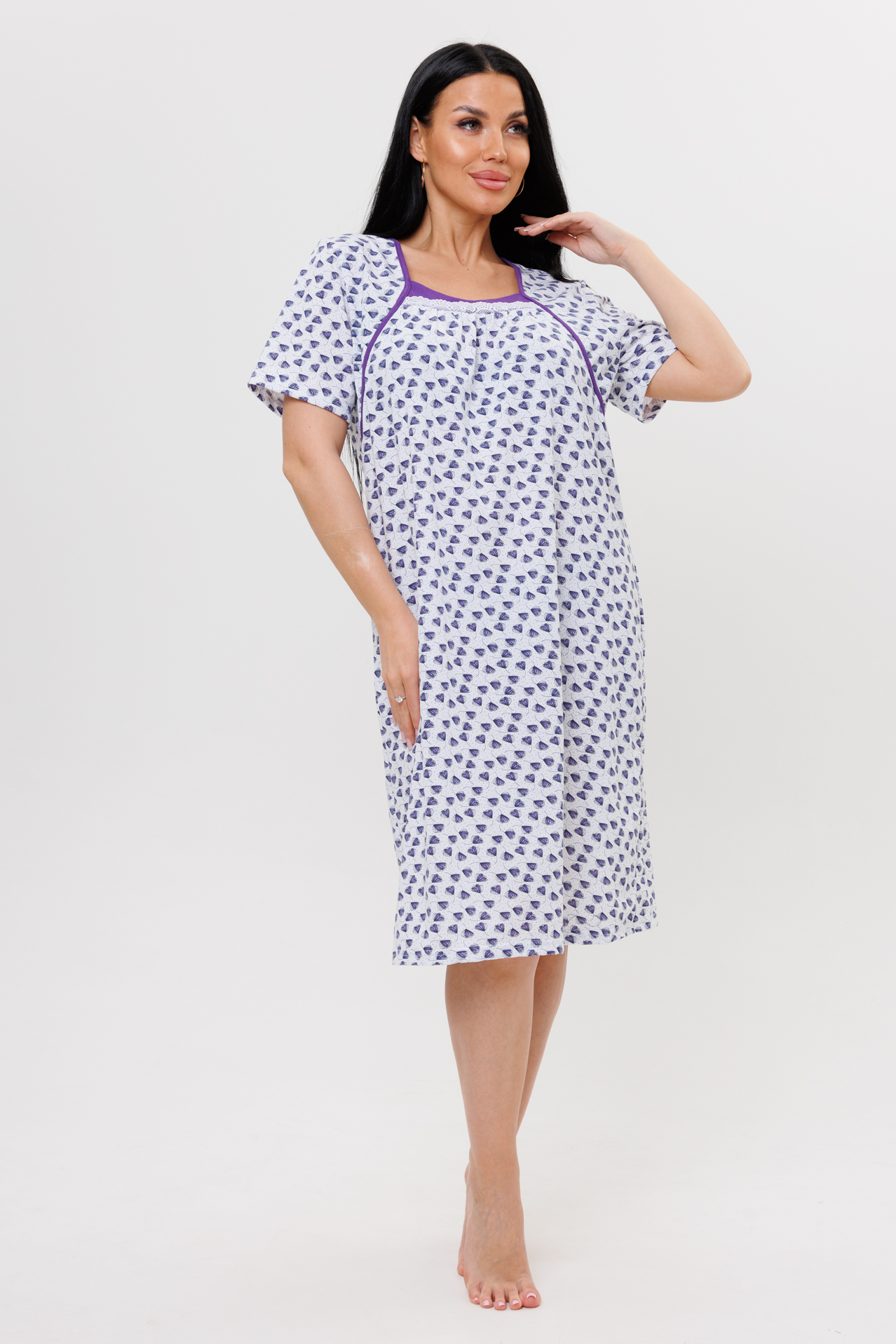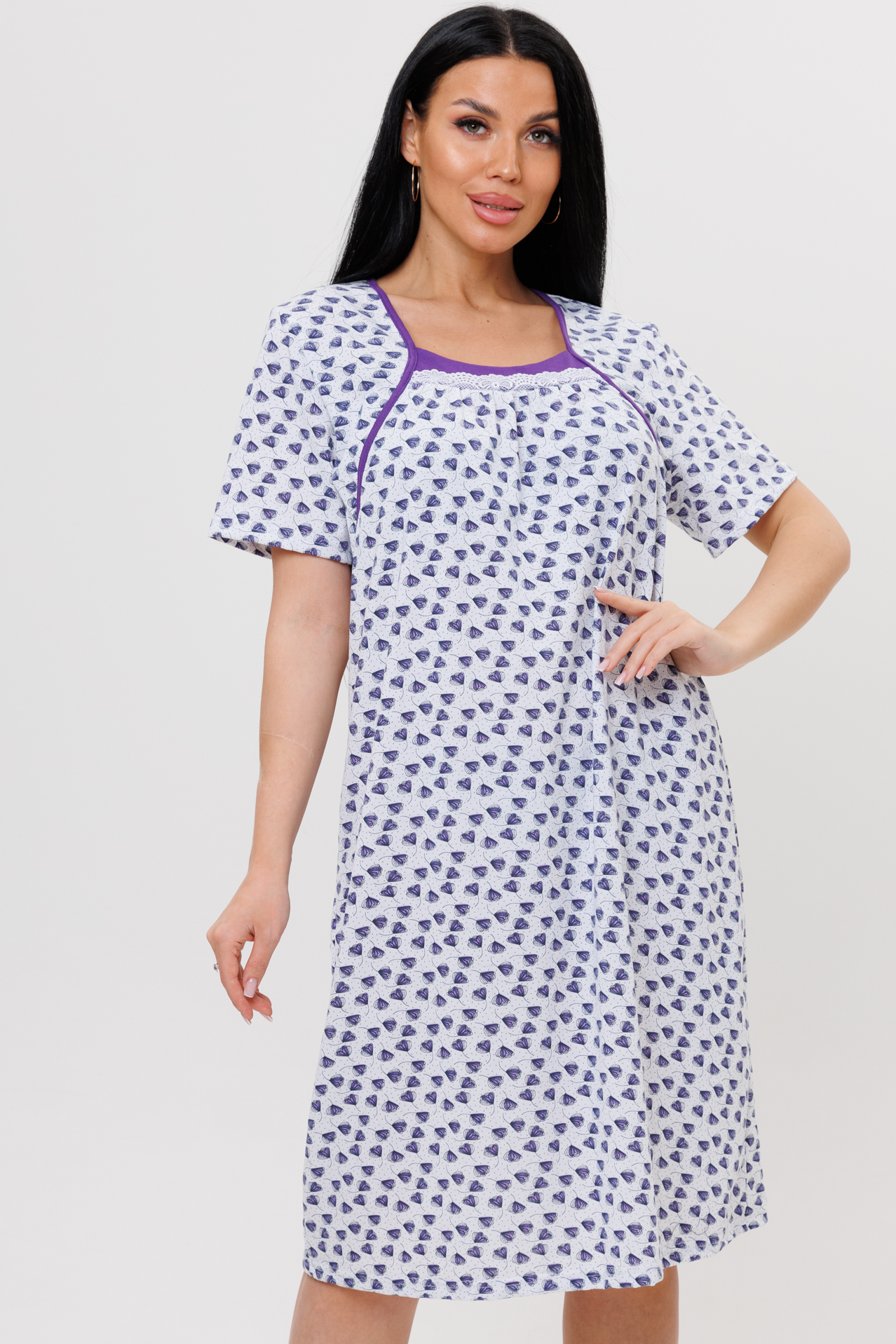 Ночная сорочка выполнена их трикотажного полотна 100% хлопка. Мягкая приятная ткань позволяет коже дышать. Ночная сорочка свободного кроя подойдет на любую женскую фигуру, а также для беременных. Ночная сорочка с коротким рукавом не сковывает движений. Грудь отделана кантом. U-образный вырез - тканью компаньоном и кружевом.