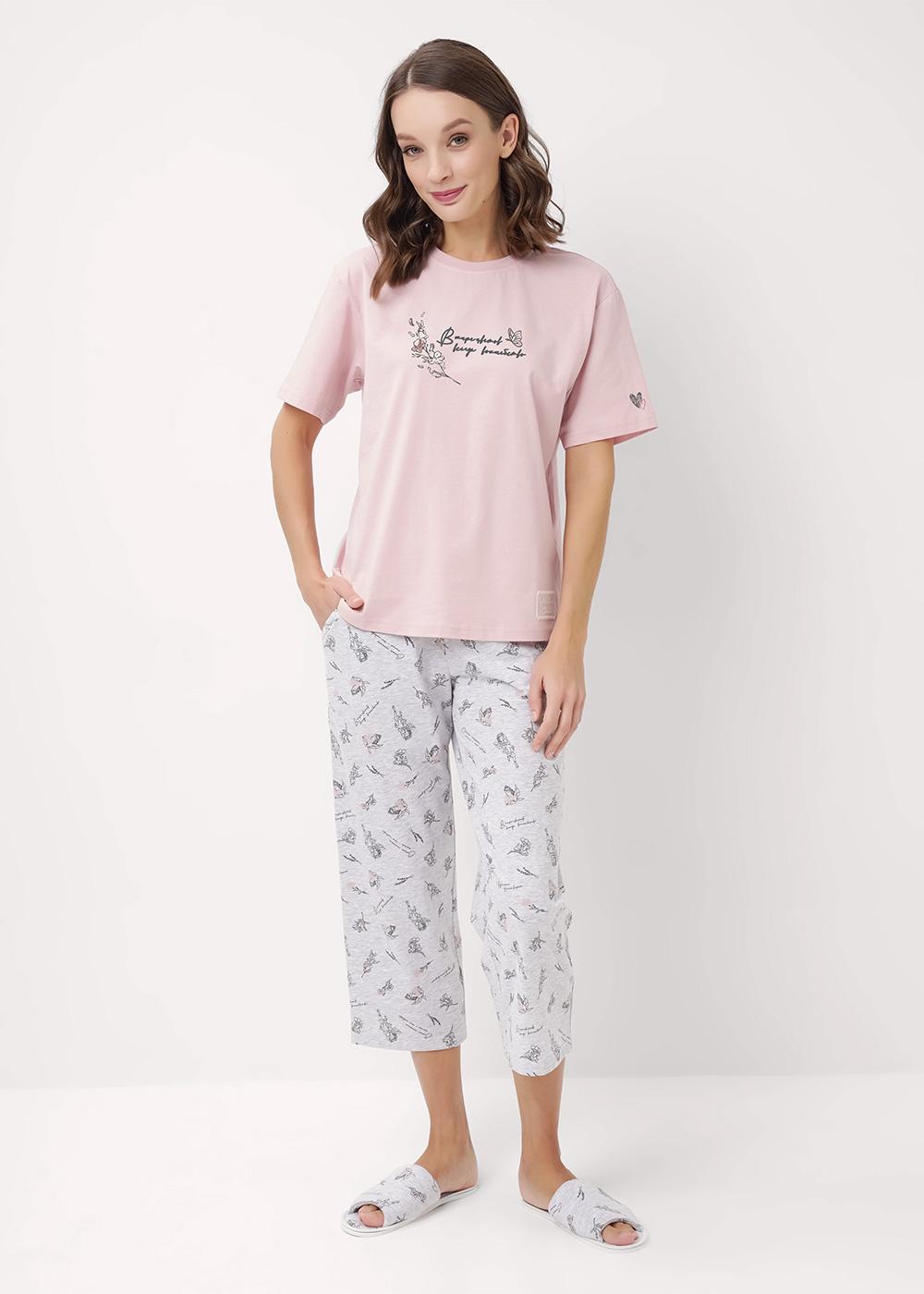 "Описание: Набор одежды из трикотажного полотна.Футболка прямого кроя,горловина с обтачкой.Короткий втачной рукав.Спереди и по рукаву принт, внизу ажурная нашивка.Бриджи с притачным поясом на внутренней резинке и киперной лентой.Боковые карманы с отрезным бочком.