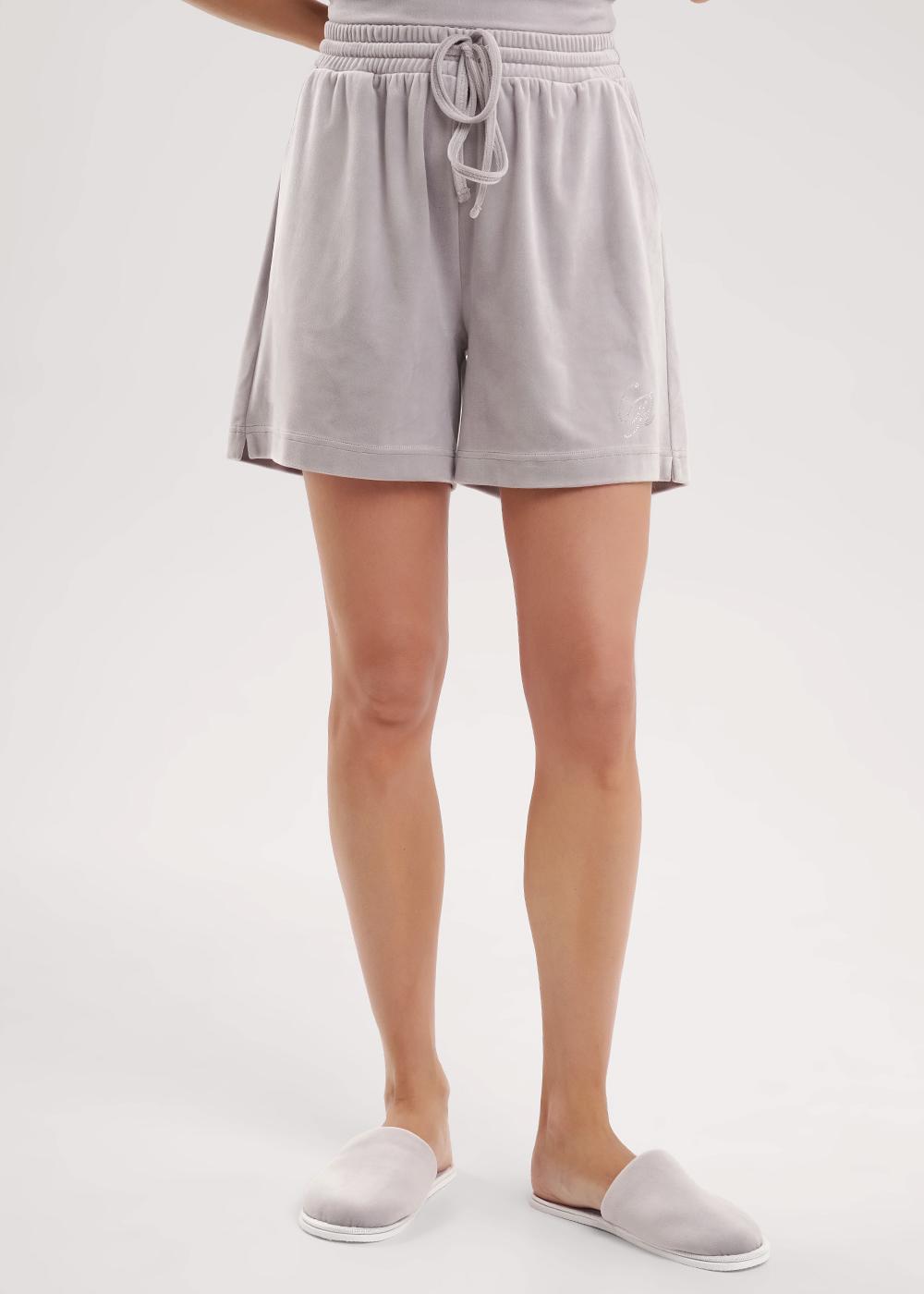 "Описание: Шорты для дома и отдыха из трикотажного полотна велюр, умеренного объема. Притачной пояс на внутренней резинке со шнуром из окантовки. Боковые карманы с отрезным бочком. По бокам разрезы. стразы.