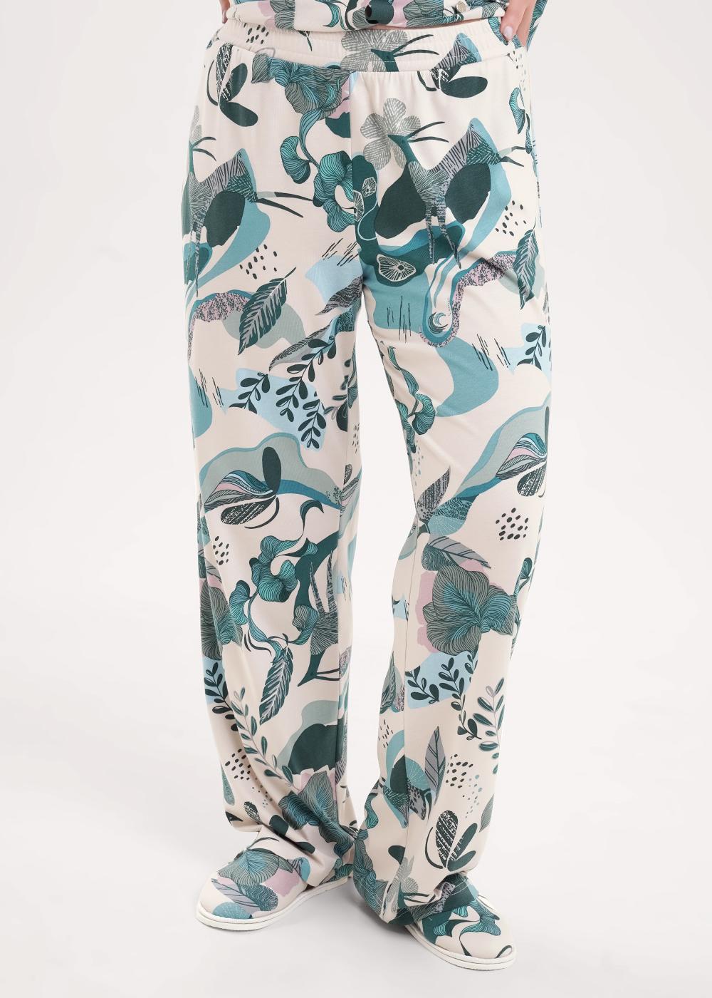 "Описание: Пижама из трикотажного полотна с модалом. Джемпер по горловине и борту обтачка с застежкой на пуговицы, накладные карманы, нашивка металл. Короткий втачной рукав. Боковые разрезы. Брюки с поясом на внутренней резинке. Боковые карманы с отрезным бочком.
