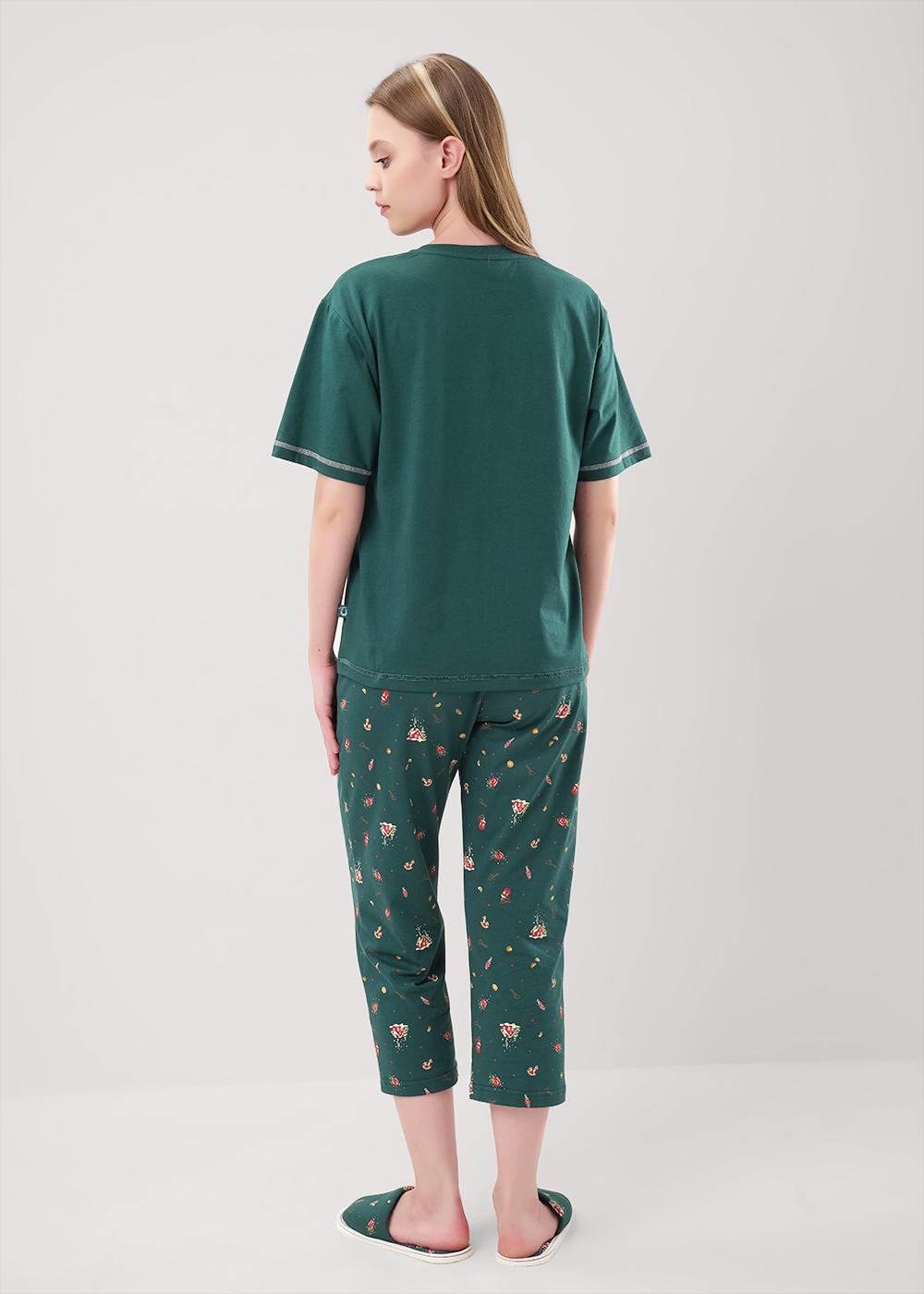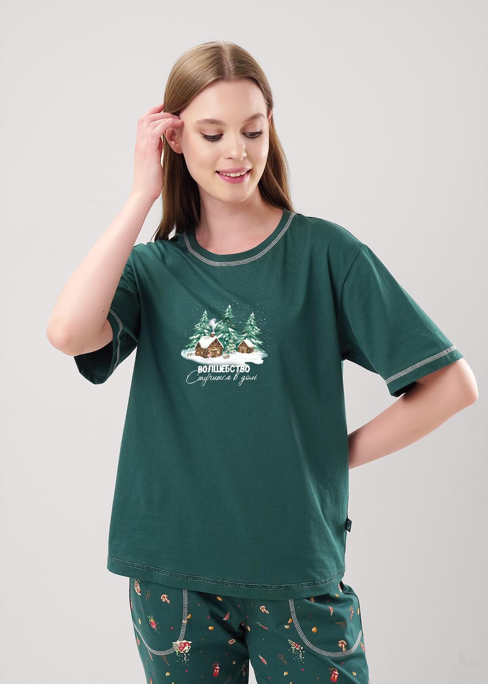 "Описание: Пижама из трикотажного полотна. Футболка с коротким втачным рукавом, внизу застил. По горловине обтачка с застилом.Спереди принт, нашивка в боковом шве.Бриджи с поясом на внутренней резинке и киперной лентой. Боковые карманы с отрезным бочком,застил.