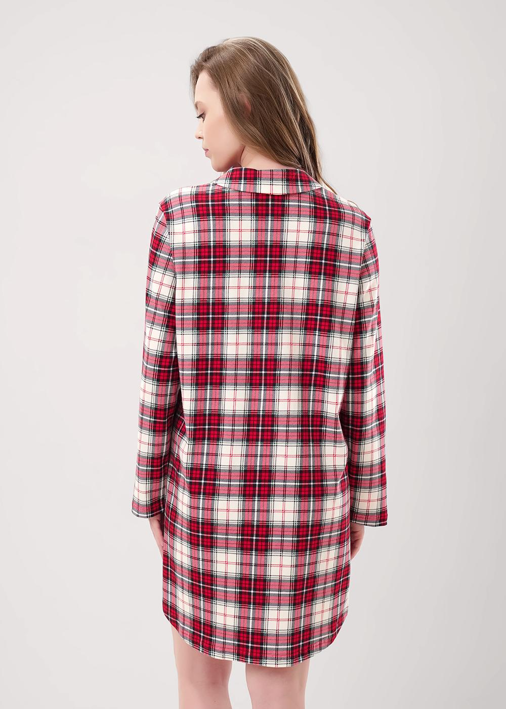 "Описание: Платье-рубашка для дома и отдыха из хлопкового трикотажного полотна с карбоном, прямого силуэта. Втачной длинный рукав. Застёжка на пуговицы, воротник с лацканами. На детали переда накладной карман, нашивка. Низ изделия округлой формы, по бокам разрезы.