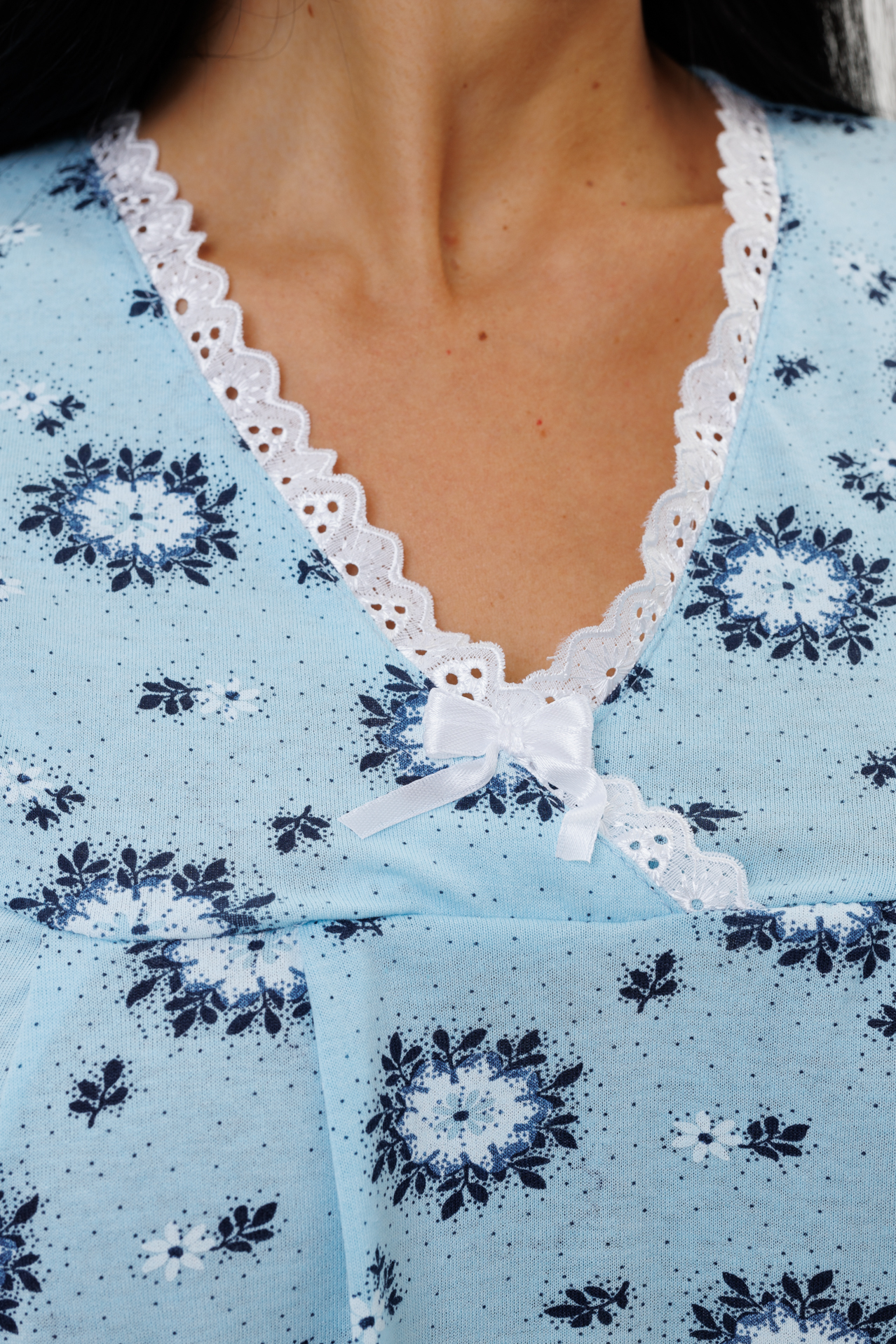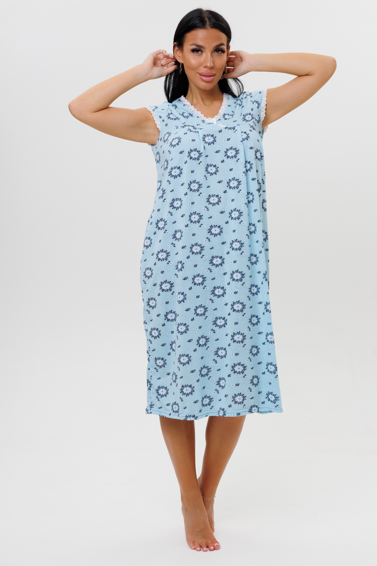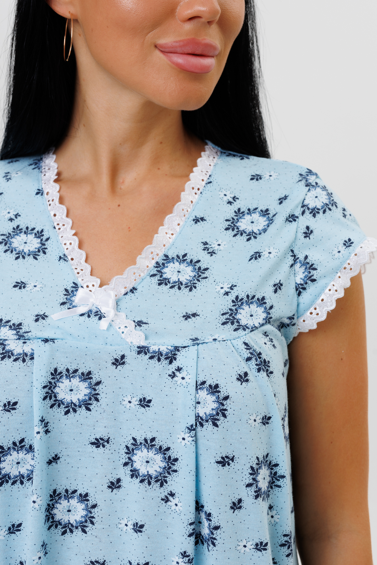 Ночная сорочка сшита из трикотажного полотна кулирки с содержанием 100% хлопка. Сорочка имеет: