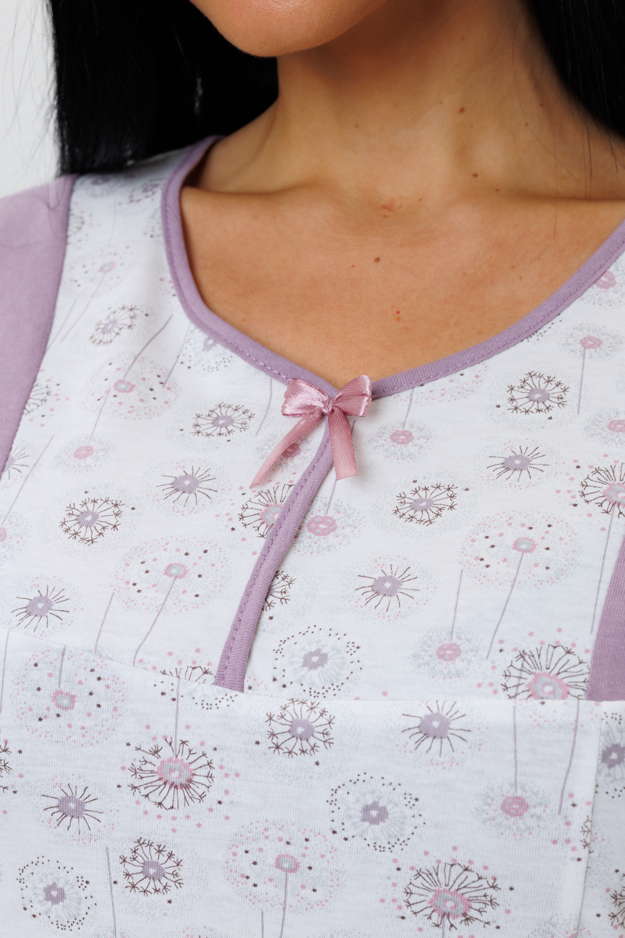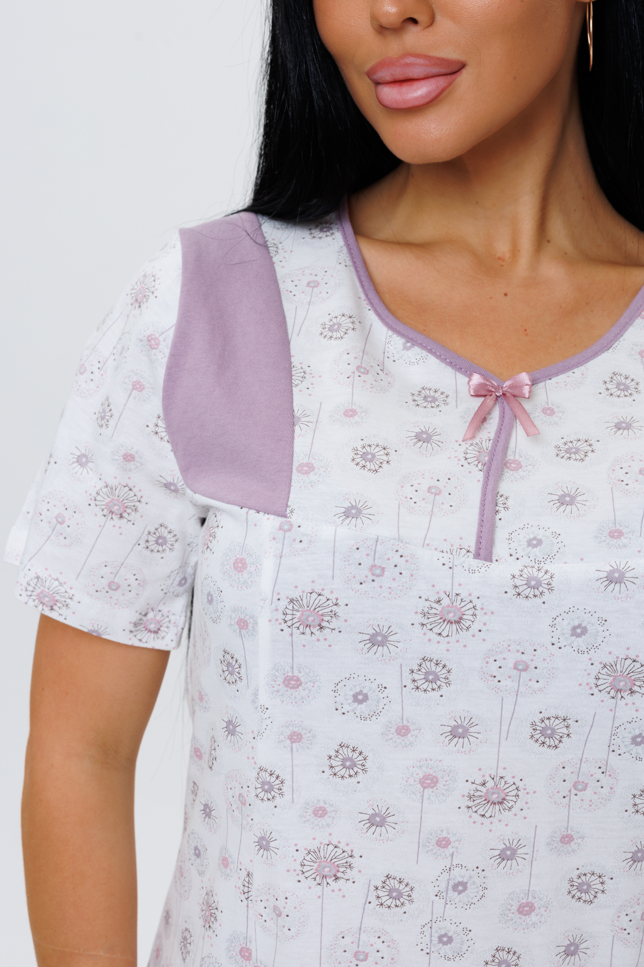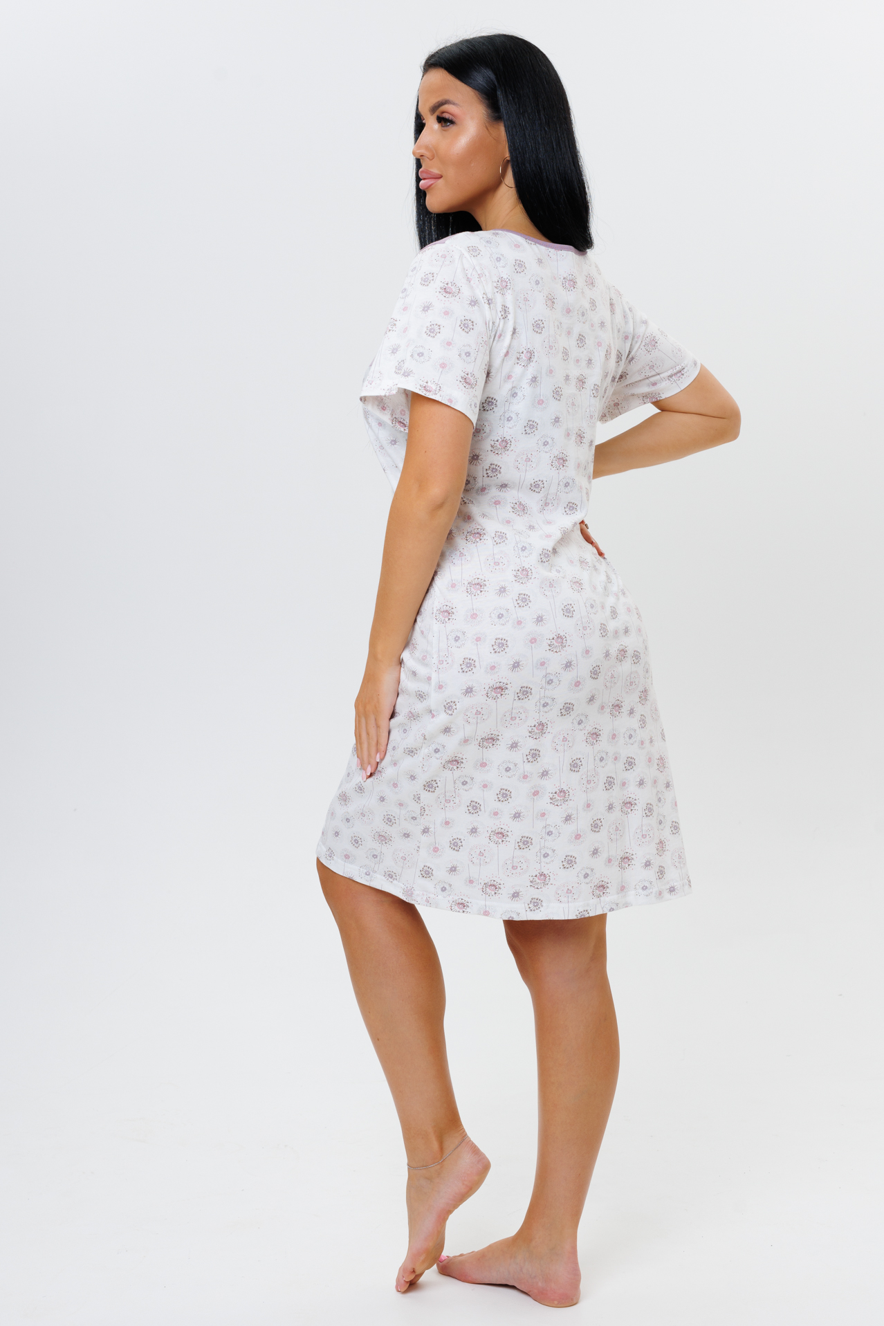 Красивая, нежная ночная сорочка с коротким рукавом сшита из трикотажного хлопкового полотна. Легкая, дышащая сорочка приятна к телу. Свободный силуэт идеально ложится по фигуре, не стесняет движений.