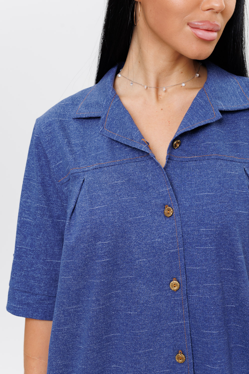 Халат-рубашка свободного кроя на пуговицах имеет отложной воротник. Втачной короткий рукав чуть ниже локтя подчеркивает манжета и пата с пуговицей.На груди кокетка и встречнве складки на полочках. Карманы вшиты в боковые линии шва.