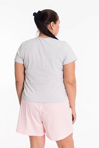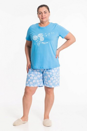 Женская пижама включает в себя футболку и шорты, выполненные из хлопкового полотна. Футболка прямого кроя с коротким рукавом и круглым вырезом горловины обеспечивает комфорт и свободу движений. Спереди на футболке нанесен принт. Шорты с поясом на широкой резинке, обеспечивают идеальную посадку и удобство. Такой дизайн позволяет свободно двигаться и чувствовать себя комфортно даже во время сна.