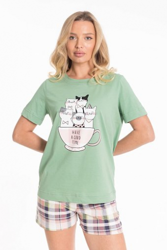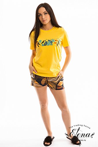 Женская пижама — отличный выбор для комфортного сна или отдыха. Она состоит из футболки и шорт, выполненных из мягкого и приятного к телу хлопкового полотна. Футболка с коротким втачным рукавов и планкой по горловине. На передней части футболки нанесён принт, который добавляет яркости и оригинальности. Шорты короткие, с боковыми карманами и притачным поясом на резинке. Они обеспечивают свободу движений и комфорт во время сна. Такая пижама идеально подойдёт для домашнего отдыха или сна. Она выполнена из качественного материала, который обеспечивает хорошую воздухопроницаемость.
