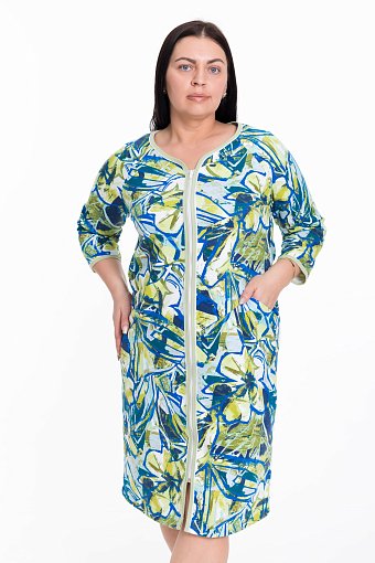Женский халат из футера 2х нитки с начесом - отличный выбор для домашнего отдыха. Прямой крой и рукав-реглан 3/4 обеспечат комфортную посадку. Фигурный вырез горловины добавляет изящества и элегантности к халату, а обработка бейкой с белым кантом придает изделию законченный вид.