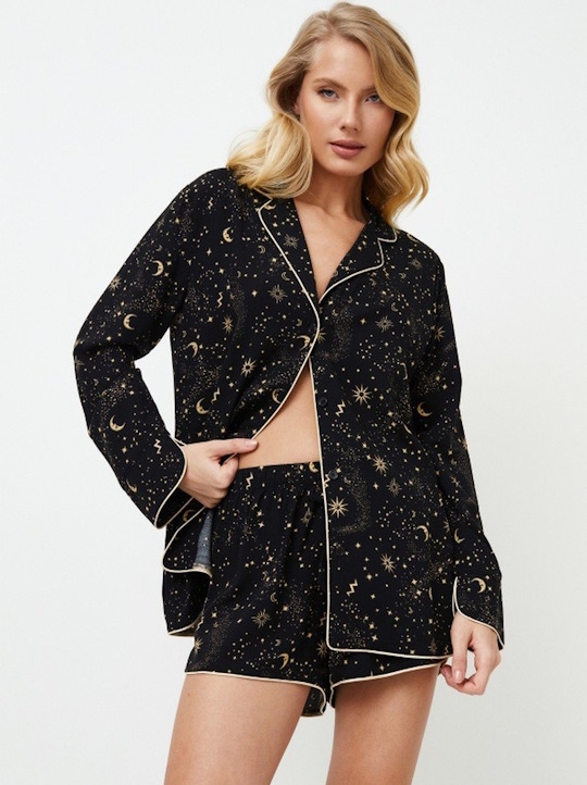 Черный 34(XS), 36(S), 38(M), 40(L), 42(XL) Представляем вашему вниманию короткую пижаму Рубашка с длинными рукавами застегивается на пуговицы и имеет стильный V-образный воротник с контрастной окантовкой по краю воротника спереди, низу и рукавам. Шорты с разрезами по бокам и окантовкой в тон по нижнему краю. Пижама потрясающего черного цвета, украшенная золотыми орнаментами ночного неба, оживляет образ перед сном. Подарите себе ощущение ночного очарования с короткой пижамой Alexandra, каждая деталь которой излучает небесное очарование. Ткань - вискоза. 100% вискоза