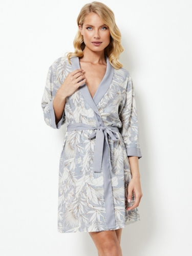 Серо-голубой 34(XS) Элегантный и непринужденный шикарный халат Alice станет восхитительным дополнением к вашей коллекции ночной одежды. Этот халат украшен очаровательным цветочным узором, излучает ощущение классической женственности. Дизайн включает в себя изящные рукава 3/4, которые красиво подчеркнуты однотонной лентой на манжетах, добавляющей уникальный контраст цветочному мотиву. Вокруг воротника такая же однотонная лента создает изысканный вид. Ткань мягкая и струящаяся, что обеспечивает стиль и комфорт для роскошного ночного образа. Легко сочетайте его с короткой пижамой Alice! 100% вискоза