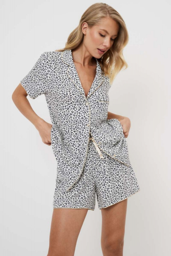 СЕРЫЙ 34(XS), 36(S), 38(M), 40(L), 42(XL), 44(XXL) Представляем вашему вниманию пижаму с шортами Beatrich — воплощение безумной мечты. Изготовлена из лёгкой вискозы с шикарным серым леопардовым принтом. Рубашка на пуговицах с короткими рукавами, окантовкой на манжетах и V-образным вырезом. Шорты с поясом-завязкой, украшены коричневой лентой и окантовкой по бокам. Этот комплект излучает необузданное очарование. Дайте волю своему воображению в наших коротких пижамных шортах Beatrich, которые идеально подходят для тех, кто не боится мечтать. 100% вискоза