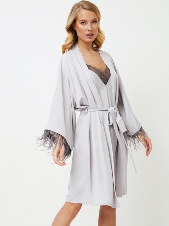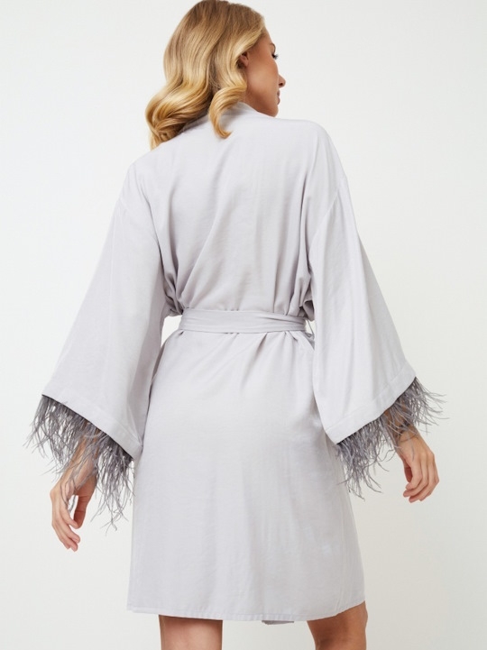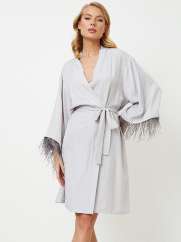 св.Серый 34(XS), 36(S), 38(M), 40(L), 42(XL) Шикарно и великолепно...не требуется больше слов… Платье Brigitte выполнено из очень мягкой ткани нежно-серого цвета с эффектом шелка. Платье украшено съемными перьями более темного цвета на манжетах и завязывается поясом. Для удобства движений платье дополнительно завязано внутренними завязками. Его легко сочетать с нашей ночной рубашкой Brigitte! 65% вискоза, 35% полиэстер