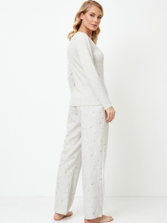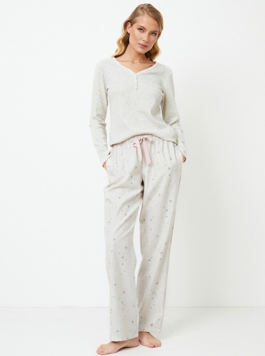 св.Серый 34(XS) Длинная пижама Doreen - идеальный вариант для стильных уютных вечеров. Топ выполнен из эластичной вискозной ткани в рубчик меланжевого серого цвета. У него длинные рукава и шикарный V-образный вырез, украшенный пуговицами. К нему прилагаются брюки обычного кроя из матовой хлопчатобумажной ткани спокойного серого цвета с россыпью звездочек. Брюки имеют карманы, пояс, завязывающийся на талии очаровательным розовым бантом, и окантовку в тон по бокам. Почувствуйте комфорт и очарование в длинной пижаме Doreen, которая идеально подходит для отдыха. И вот в чем фишка надев их, вы гарантированно станете звездой собственного шоу перед сном!Кофта 76% вискоза, 19% полиэстер, 5% эластанБрюки 100% хлопковый фланель
