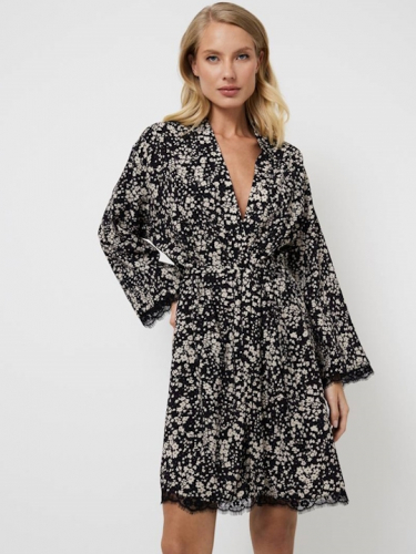 Черный 34(XS), 36(S), 38(M), 40(L), 42(XL) Представляем вам женский халат Eli — потрясающее сочетание элегантности и женственности. Создан из лёгкой вискозы с изысканным цветочным узором. Этот изысканный халат с длинными рукавами, украшен замысловатыми чёрными кружевными деталями вдоль рукавов и нижнего края, что придаёт дизайну нотку романтики. Халат Eli, идеально подходит для любого случая, окутает вас изящной изысканностью и роскошным комфортом, и вы будете чувствовать себя великолепно. 100% вискоза