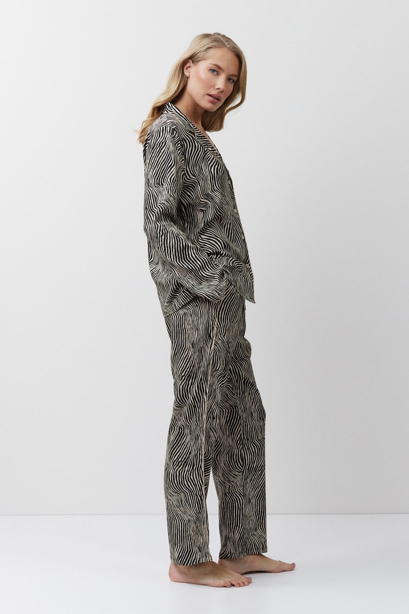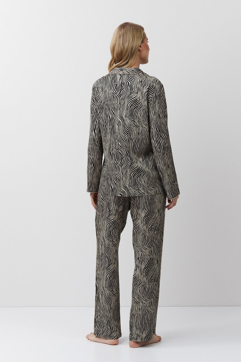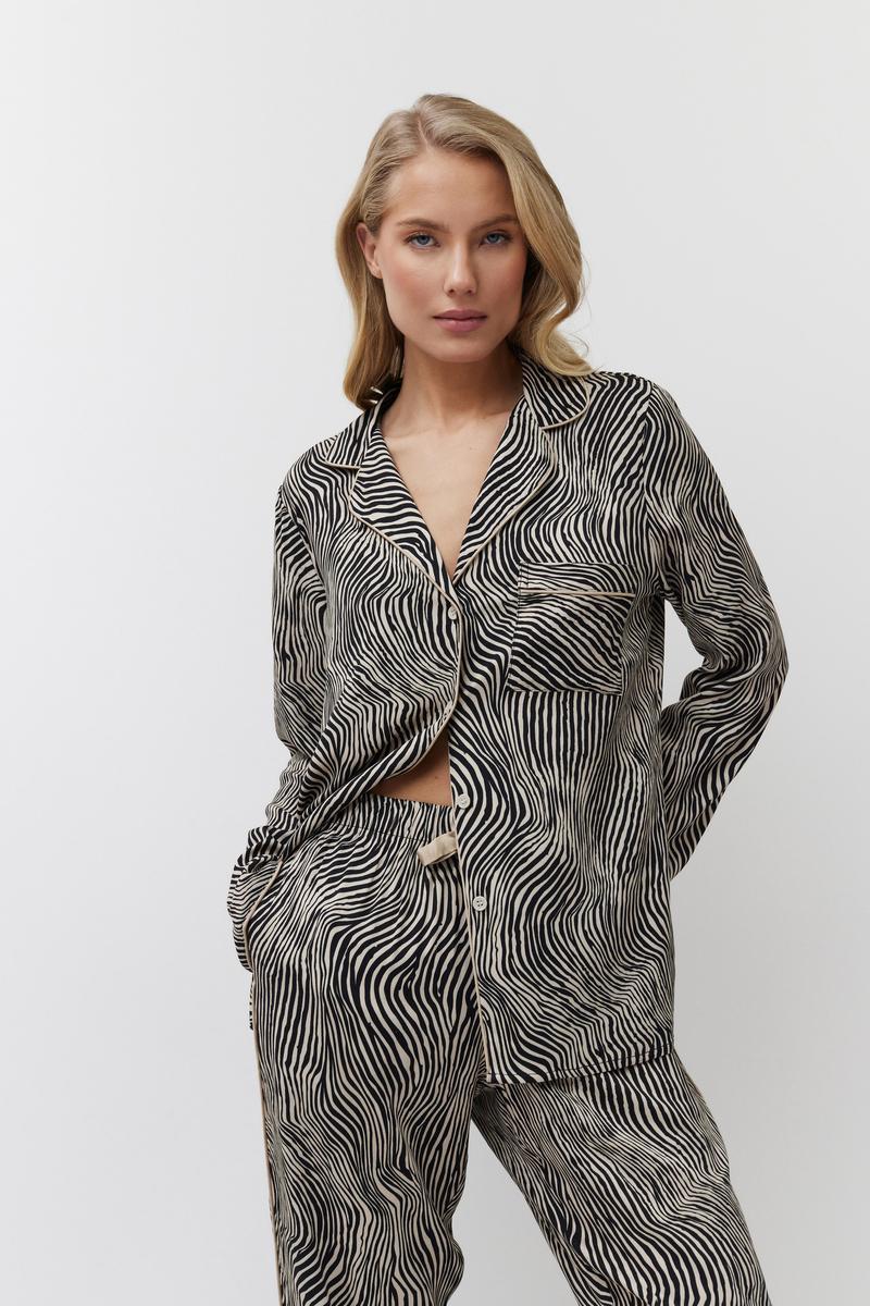 Пижама женская со штанами LINNA для вашего ночного комфорта. Пижама выполнена из вискозы с легким эластаном, с животным принтом. Рубашка на пуговицах, с длинными рукавами, отложным воротником и нагрудным карманом. Окантовка дополняет и украшает комплект. Штаны свободные, с эластичным поясом с завязкой. Расслабьтесь с максимальным комфортом и стилем в пижаме LINNA. 97% вискоза/ 3% эластан