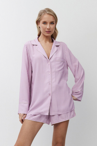 Пижама женская с шортами MARGARETH для вашего ночного комфорта. Пижама выполнена из вискозы. Рубашка на пуговицах, с длинными рукавами, отложным воротником и нагрудным карманом. Окантовка дополняет и украшает комплект. Шорты короткие, свободной формы, с эластичным поясом с завязкой. Расслабьтесь с максимальным комфортом и стилем в пижаме MARGARETH. 100% вискоза