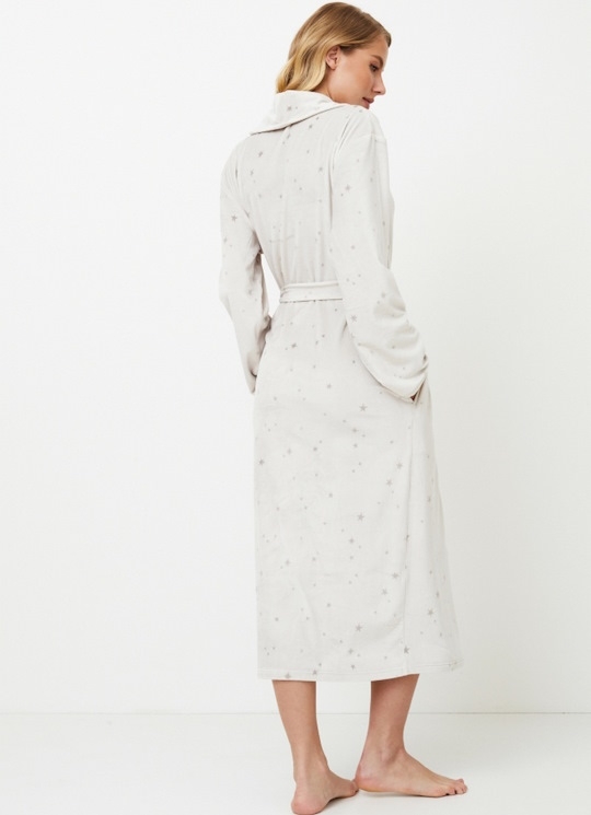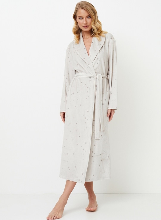 св.Серый 36(S), 38(M), 40(L), 42(XL), 44(XXL) Представляем вашему вниманию халат Meredith - ваш билет к блаженному комфорту и стилю. Этот халат длиной ниже колена из мягкой ткани серого цвета, украшенной изящными звездочками, окутывает вас и дарит уют. В нем есть пояс на талии и удобные карманы, поэтому он так же полезен, как и уютен. Приготовьтесь к стильному отдыху в халате Meredith, который станет вашим идеальным спутником в моменты расслабления. 95% полиэстер, 5% эластан