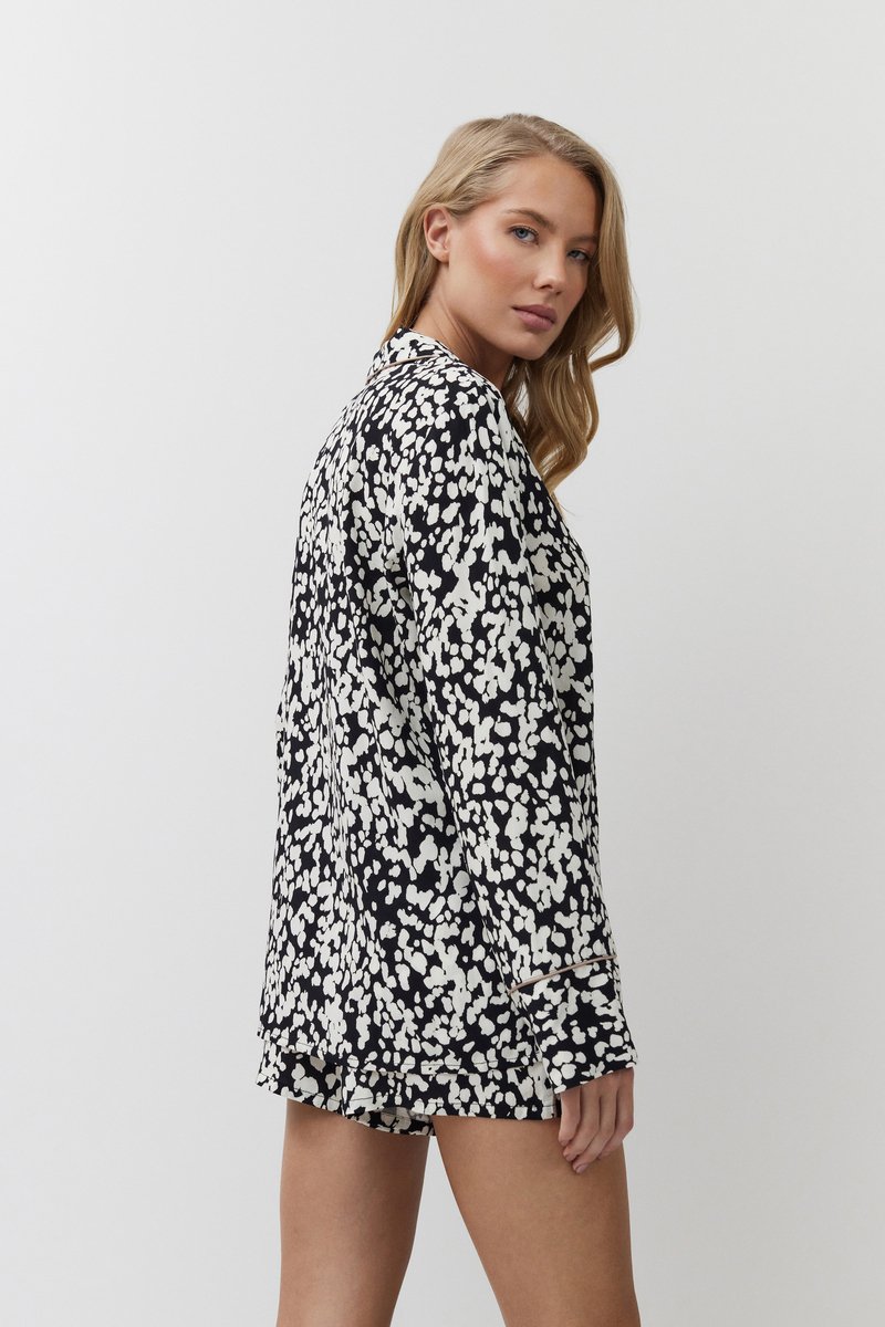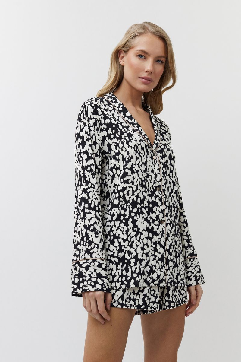 Пижама женская с шортами SOLENE для вашего ночного комфорта. Пижама выполнена из вискозы. Рубашка на пуговицах, с длинными рукавами, отложным воротником. Окантовка дополняет и украшает комплект. Шорты свободные, с эластичным поясом с завязкой. Расслабьтесь с максимальным комфортом и стилем в пижаме SOLENE. 100% вискоза
