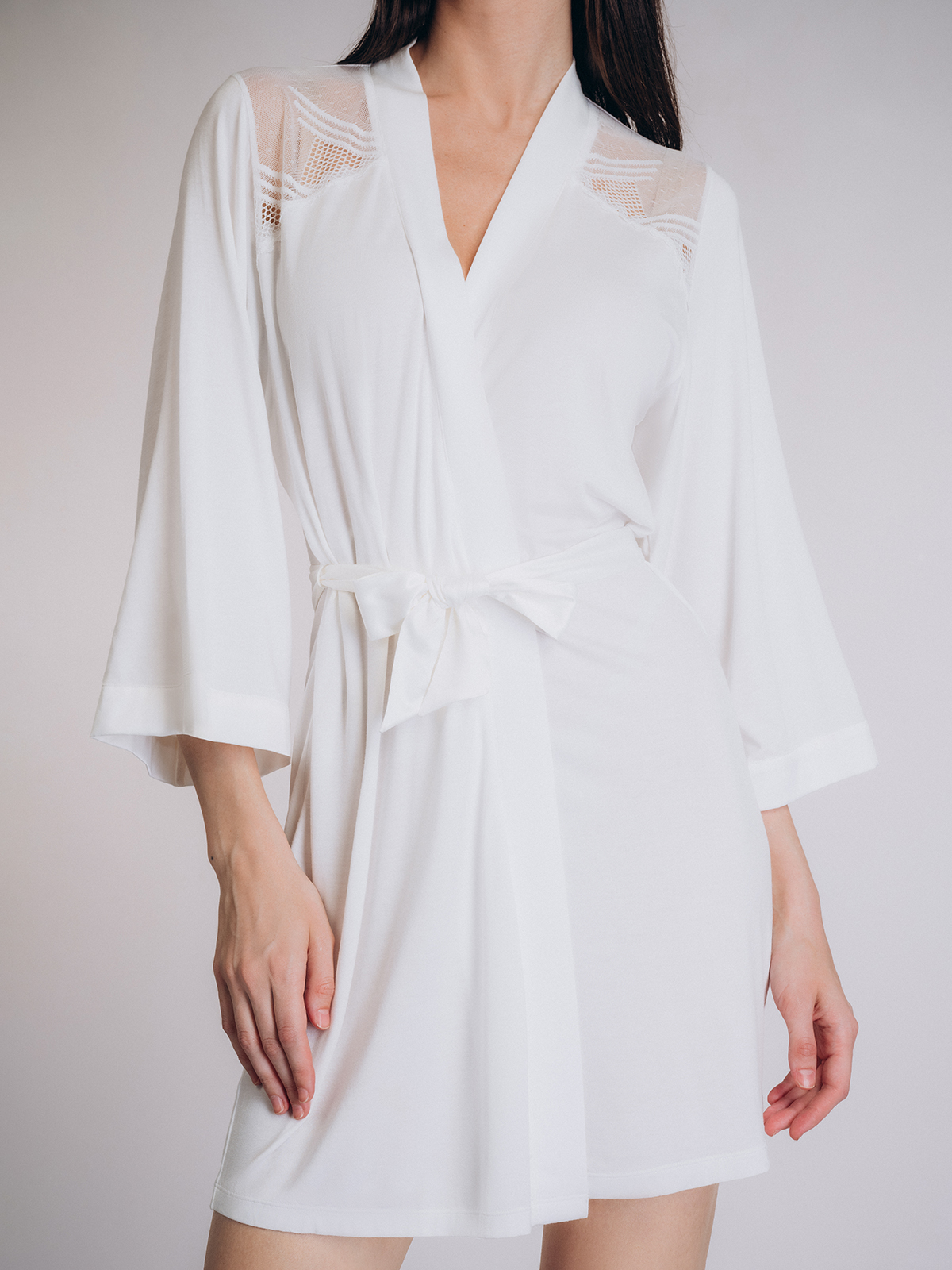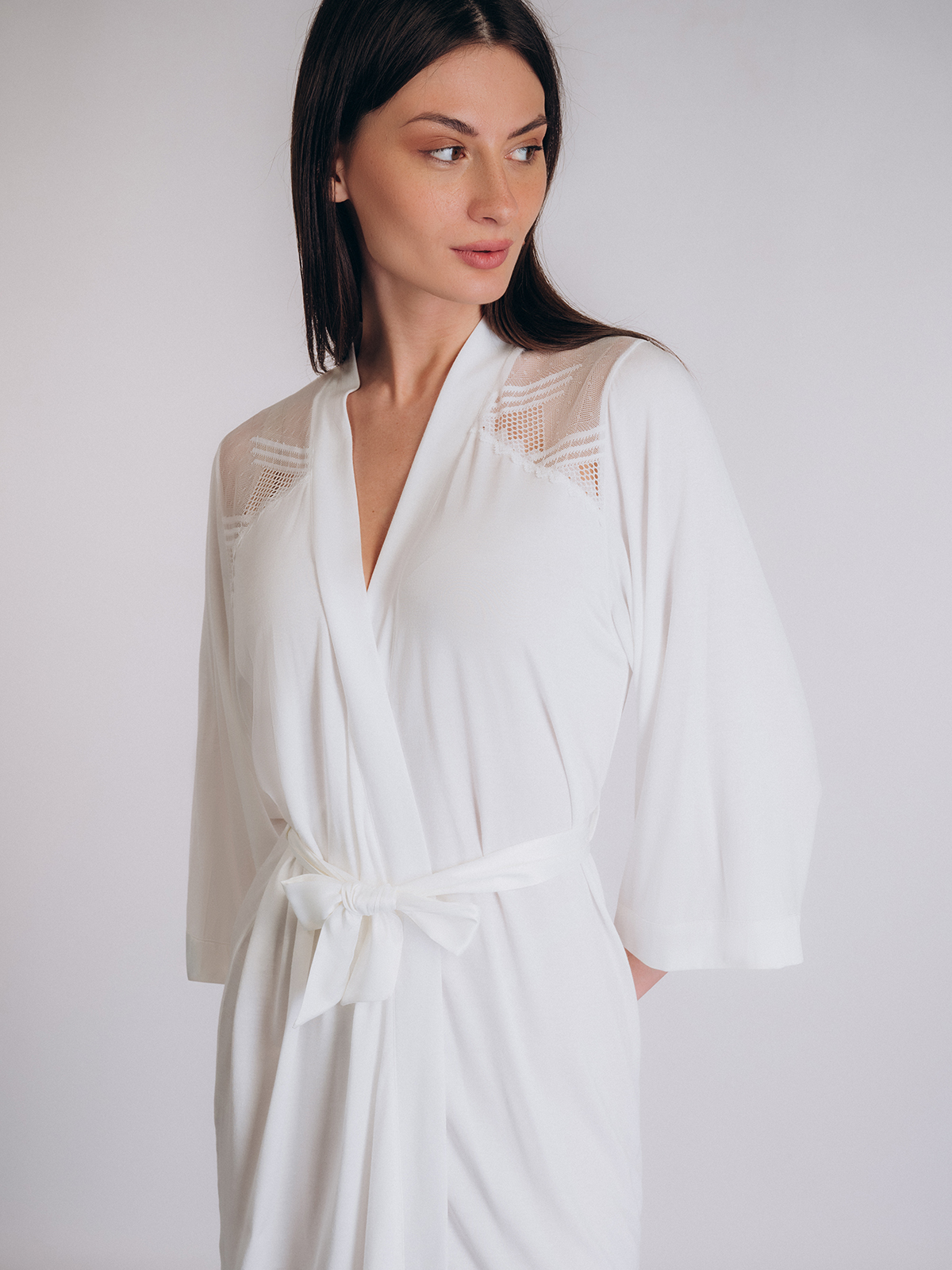 Женский халат Indefini белого цвета с кружевными вставками. Выполнен из легкой струящейся ткани, которая мягко обволакивает фигуру, создавая ощущение комфорта и роскоши.