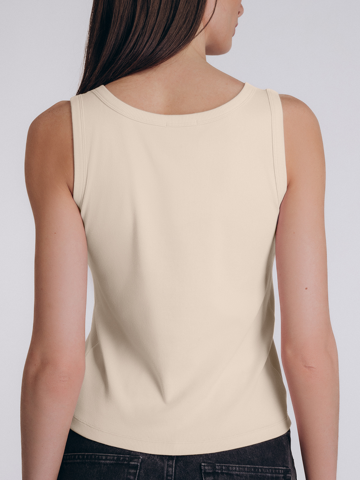 Бежевая майка классического кроя из хлопково-вискозного полотна с тонкой рубчатой текстурой.