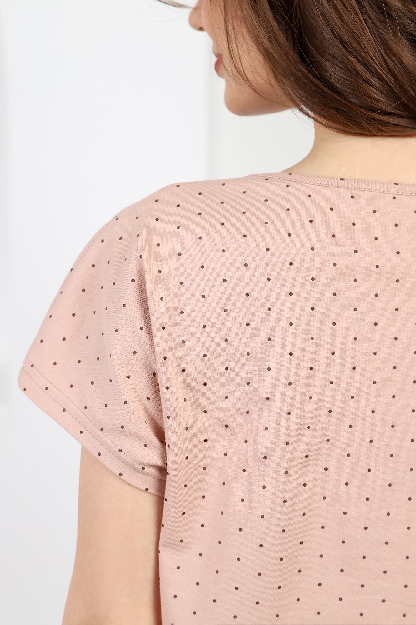 Пижама из трикотажного полотна «кулирка» в комбинации с трикотажным полотном «махра» с набивным рисунком в единой цветовой гамме, состоящая из футболки и шорт. Футболка – из гладкокрашеного полотна «кулирка», классического покроя, с короткими цельнокроеными рукавами, горловиной v- образной формы, окантованной основным материалом. На полочке принт, выполненный в технике «шелкографии».Шорты – из полотна «махра», средней длины, расширенные книзу с эластичной тесьмой по талии.