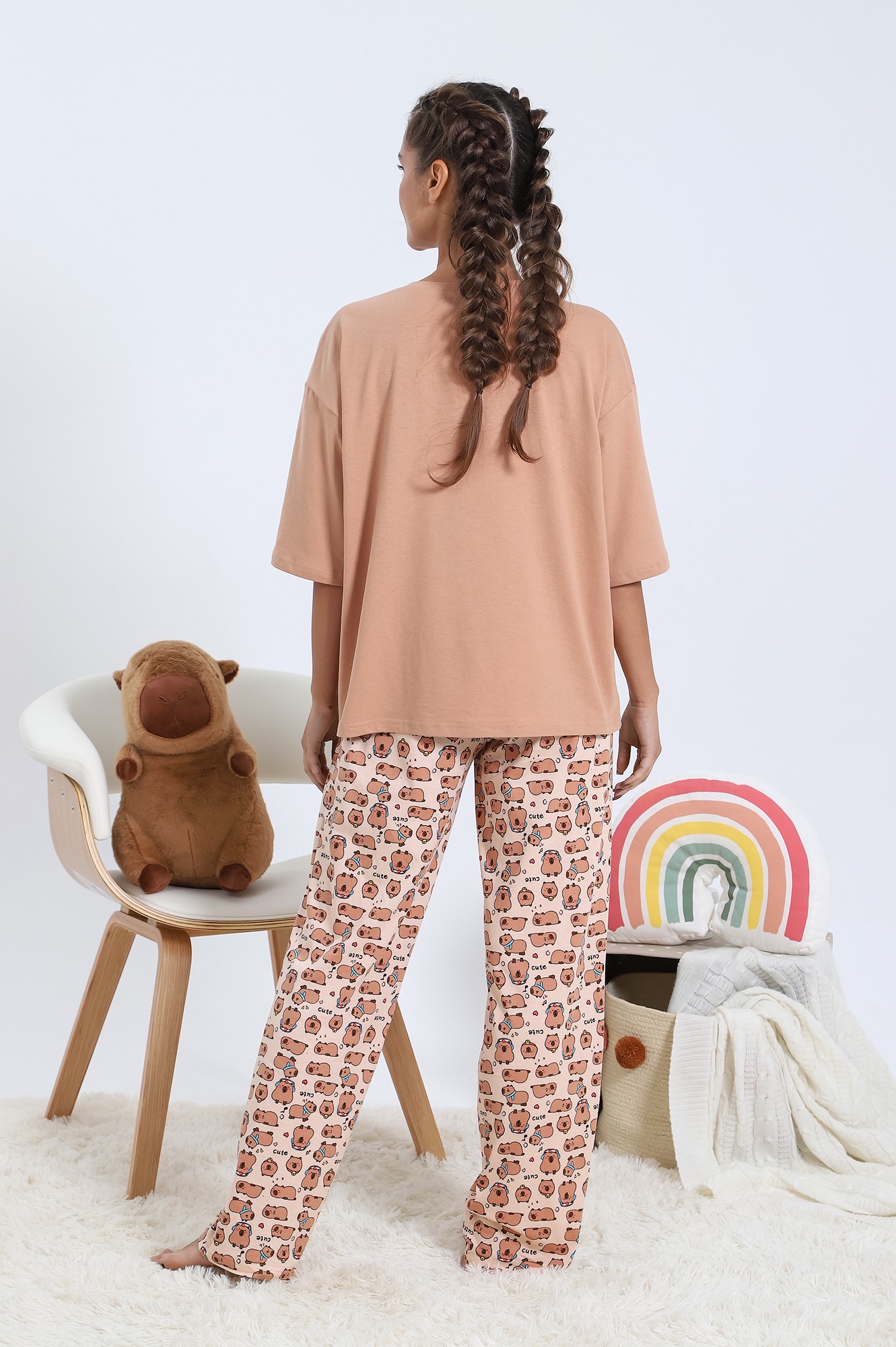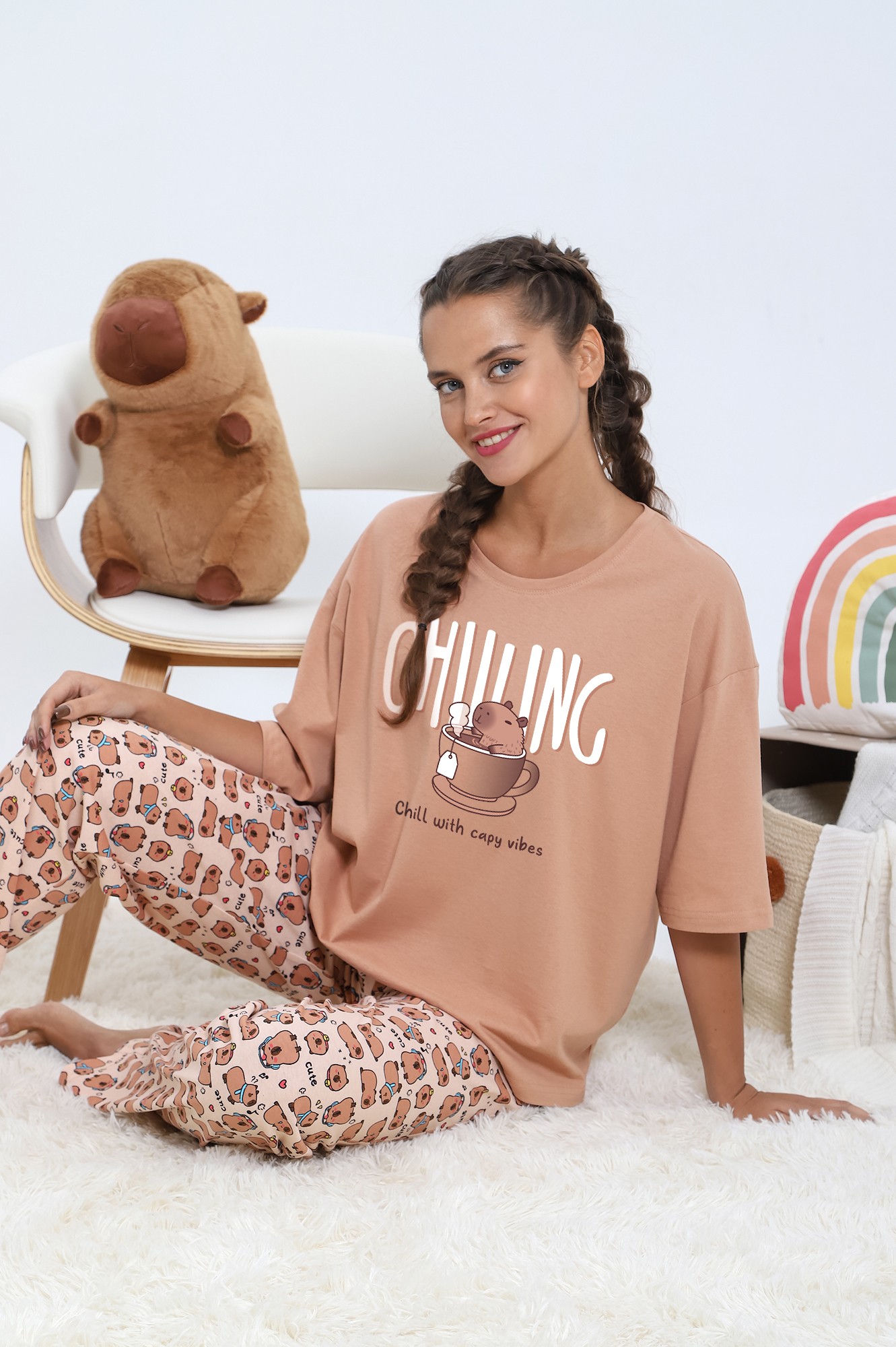 Пижама женская, состоящая из футболки и брюк. Футболка - из гладкокрашеного полотна , свободного покроя, укороченная, с коротким втачными рукавами и горловиной овальной формы, обработанной втачной бейкой. Нижние срезы рукавов и изделия обраотаны швом вподгибку. По шву втачивания планки в горловину настрочена отделочная строчка. На детали переда - принт, выполненный методом шелкографии. Брюки - из полотна с набивным рисунком, длинные, свободного покроя. Верхний срез обработан швом вподгибку с эластичной тесьмой, нижние - швом вподгибку.