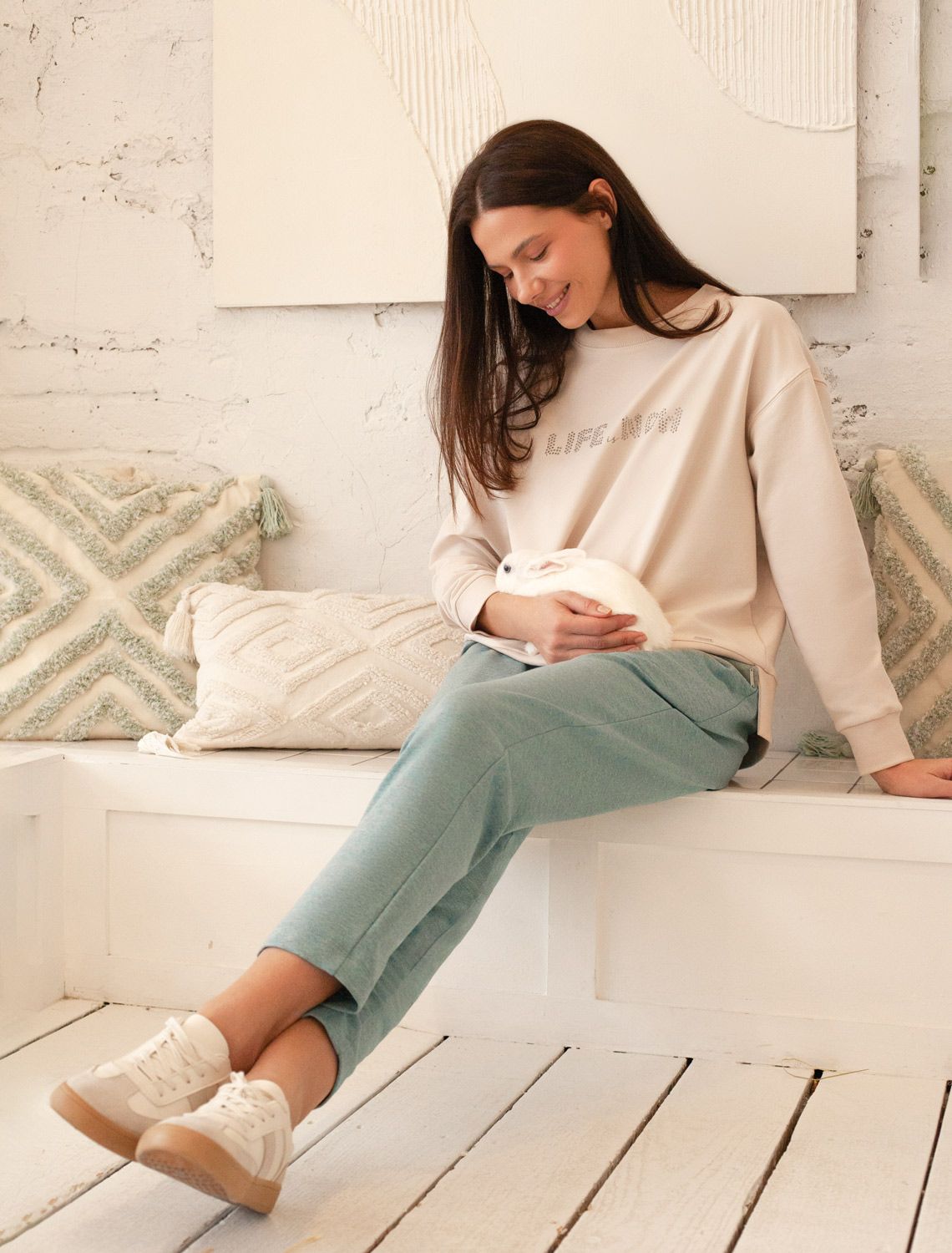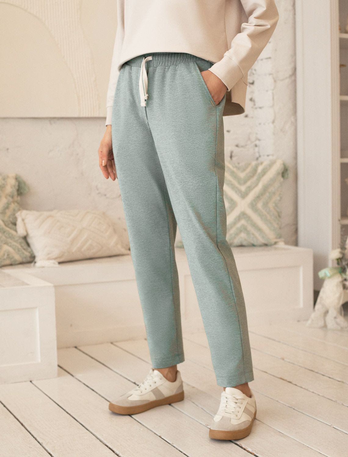 Брюки выполнены из тонкого хлопкового футера. Эластичный материал хорошо пропускает воздух, позволяя телу дышать, и легко тянется, не ограничивая движения. Пояс на резинке дополнен внутренним шнуром, для комфортной регулировки изделия. Брюки сочетаются в костюме с джемпером D49.054 и D49.055 оливковый меланж