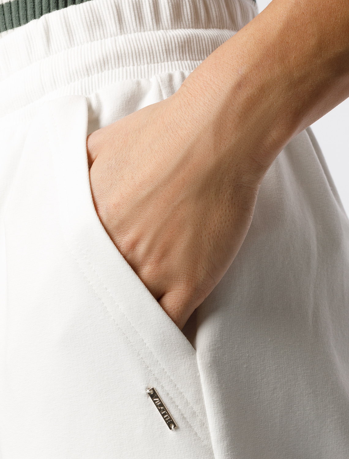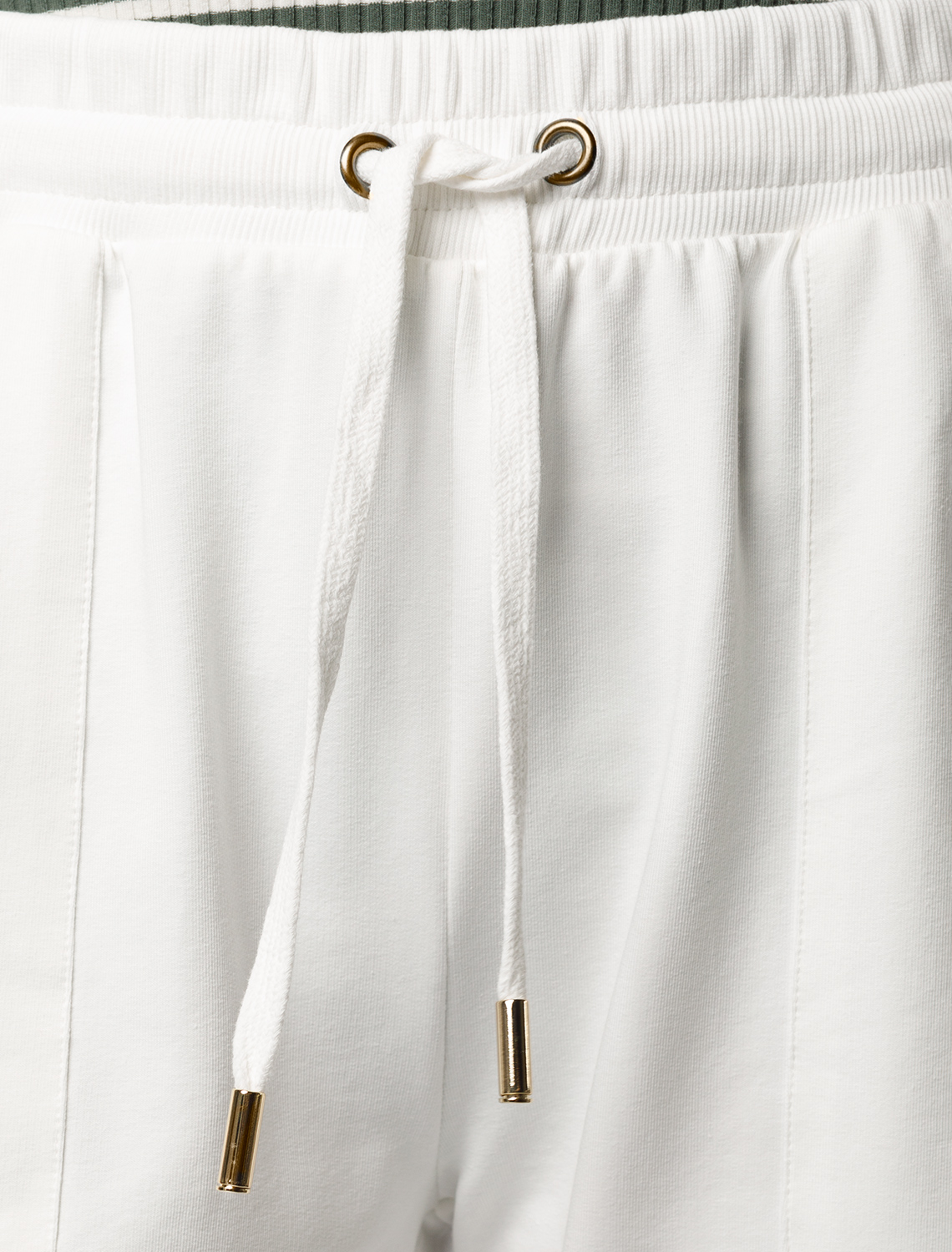 Брюки выполнены из футера двухнитки с эластаном. Модель зауженная к низу дополнена карманами и эластичным поясом с фактурой в рубчик. В пояс вставлен плоский хлопковый шнур в тон изделия с золотистыми наконечниками. Изделие дополнено металлическим логотипом бренда. Сочетается в костюме с жакетом D49.078, джемпером D49.079, D49.080 и футболкой D49.081 молочный