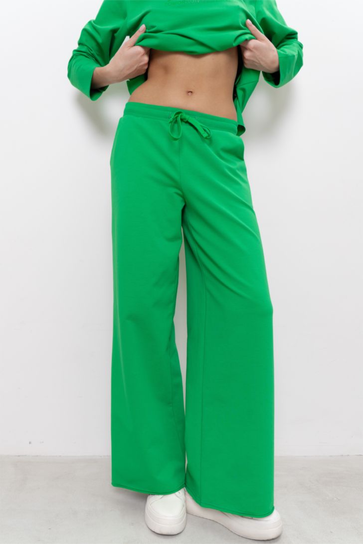 Брюки прямые, широкие из футера 2-нитки в поясе резинка и кулиса со шнурком. В боковых швах карманы.