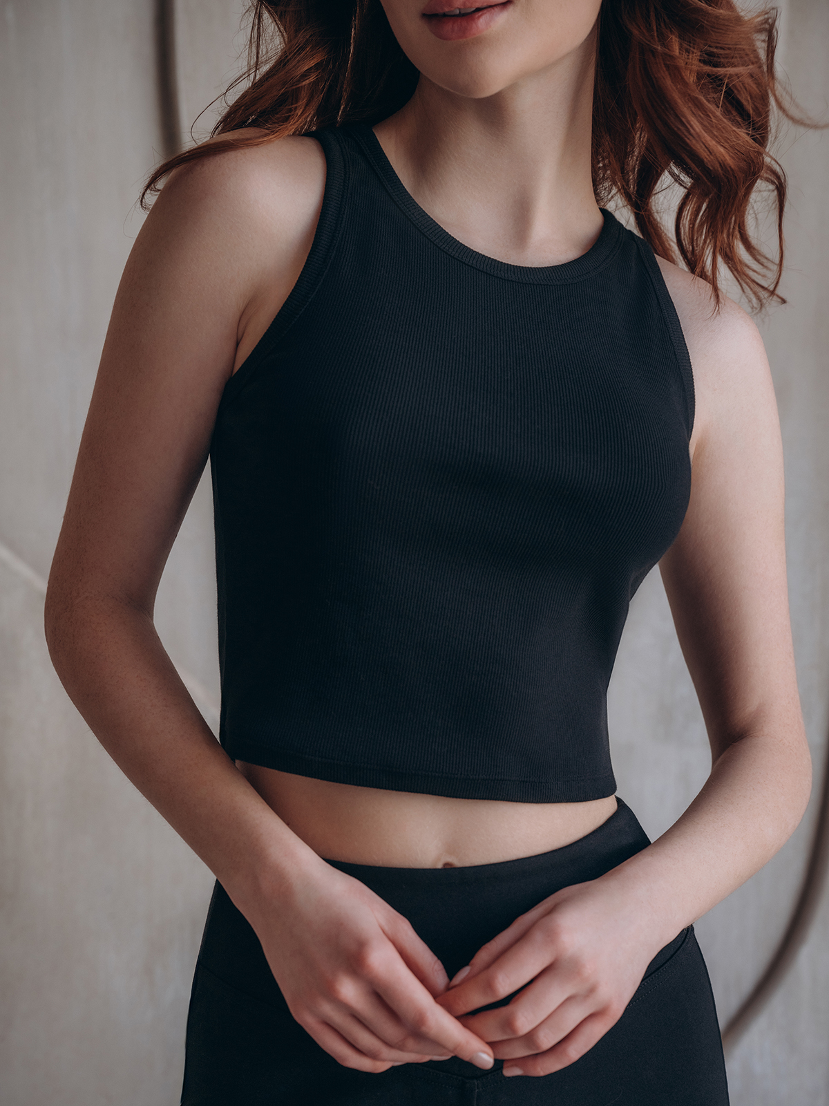 Облегающий черный топ из мягкого хлопка с добавлением эластана для эластичности и комфорта. Плотная ткань в мелкий рубчик хорошо держит форму и подчеркивает силуэт.