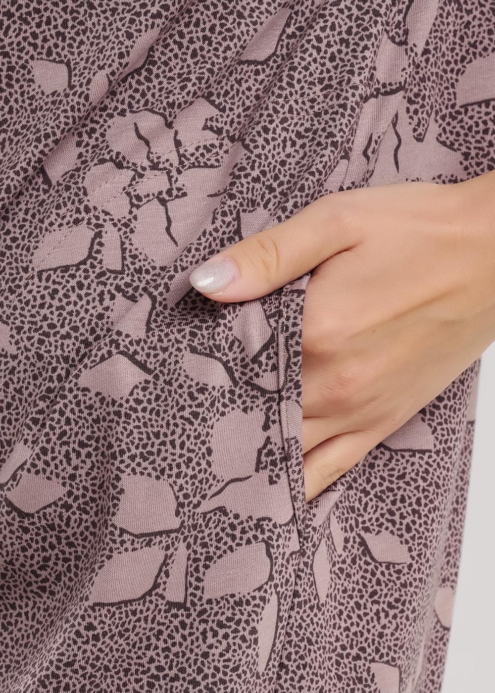 Платье для дома и отдыха из трикотажного полотна с добавлением модала, прямого силуэта с застежкой на пуговицы. Втачной короткий рукав, по низу рукава манжет с кантом. По горловине воротник с лацканами. Боковые карманы с окантовкой.