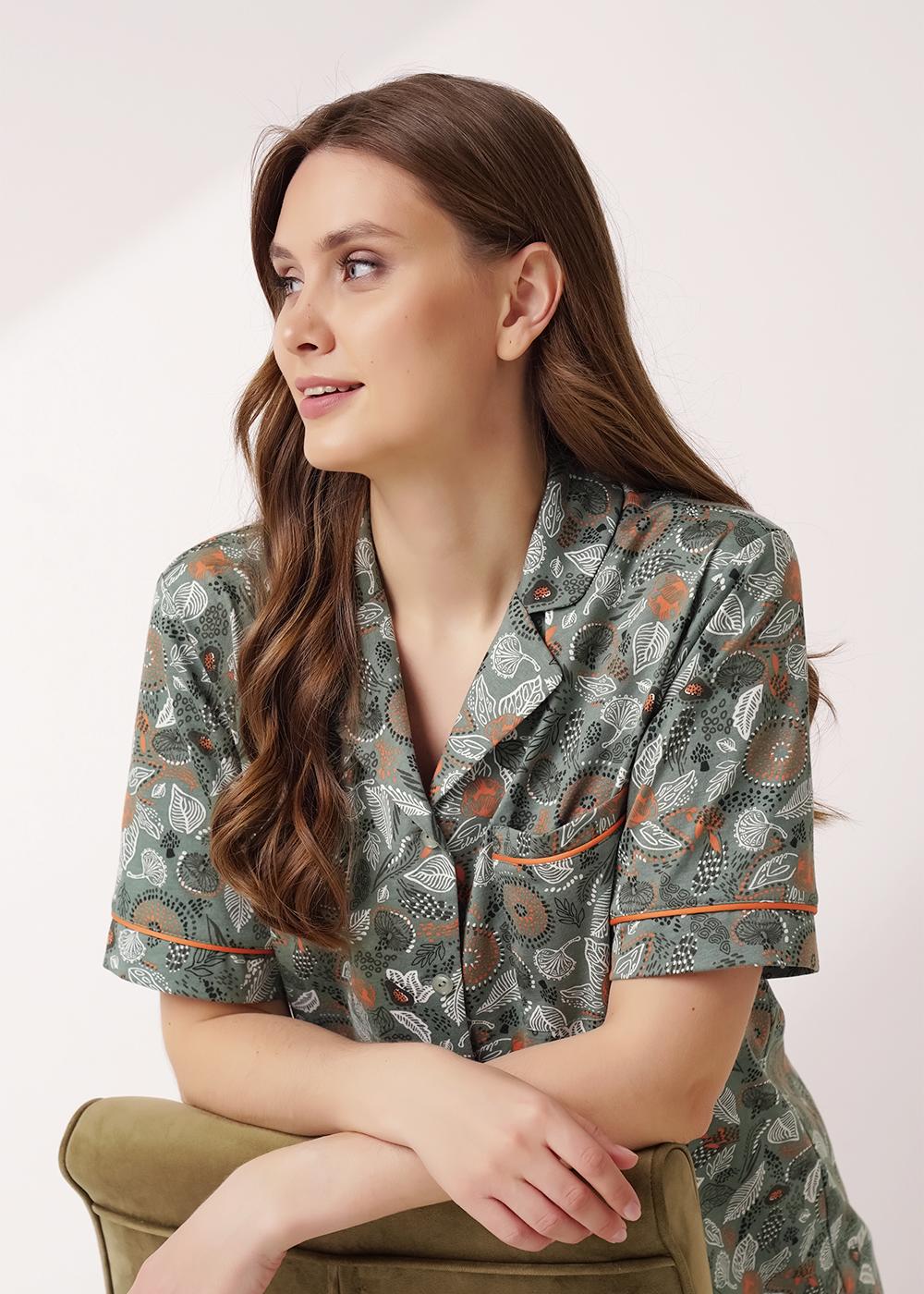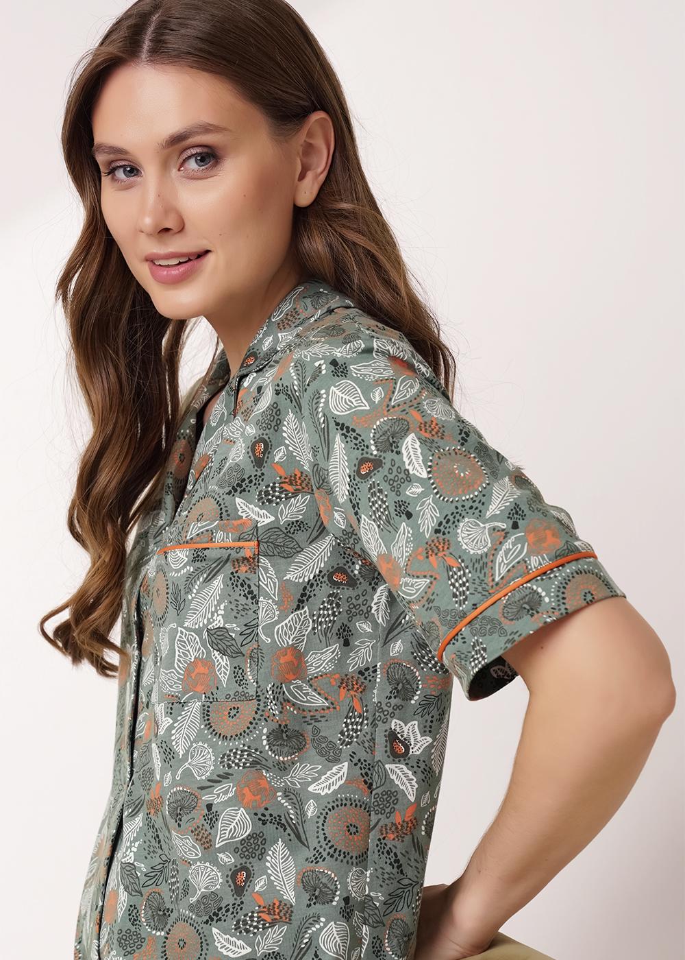 "Описание: Платье для дома и отдыха прямого силуэта из хлопкового трикотажного полотна. Застёжка на пуговицы, отложной воротник с лацканами. Втачной короткий рукав, внизу с контрастным кантом. Спереди накладной карман с контрастным кантом. Боковые разрезы.
