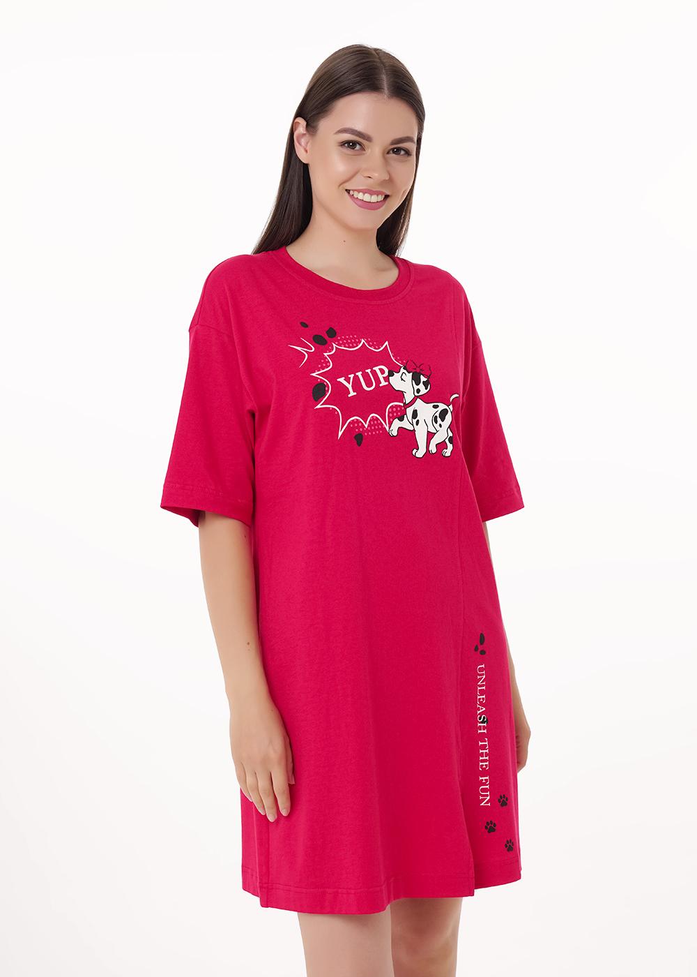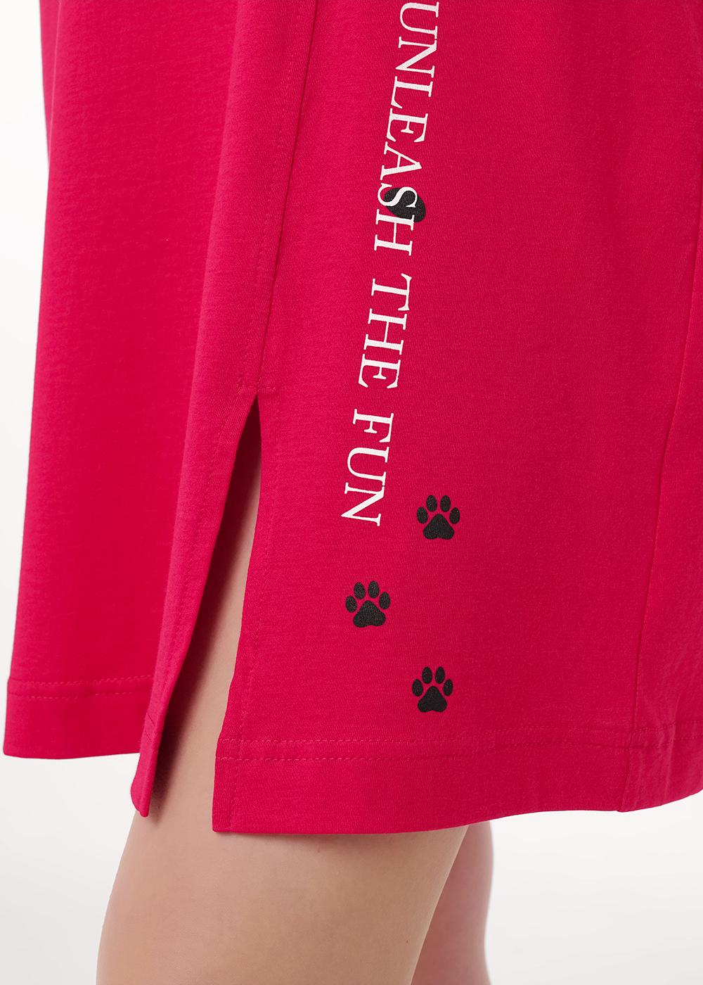 Платье для дома и отдыха из хлопкового трикотажного полотна прямого кроя. Округлая горловина с обтачкой. Короткий втачной рукав. По переду рез с разрезом .Спереди принт.