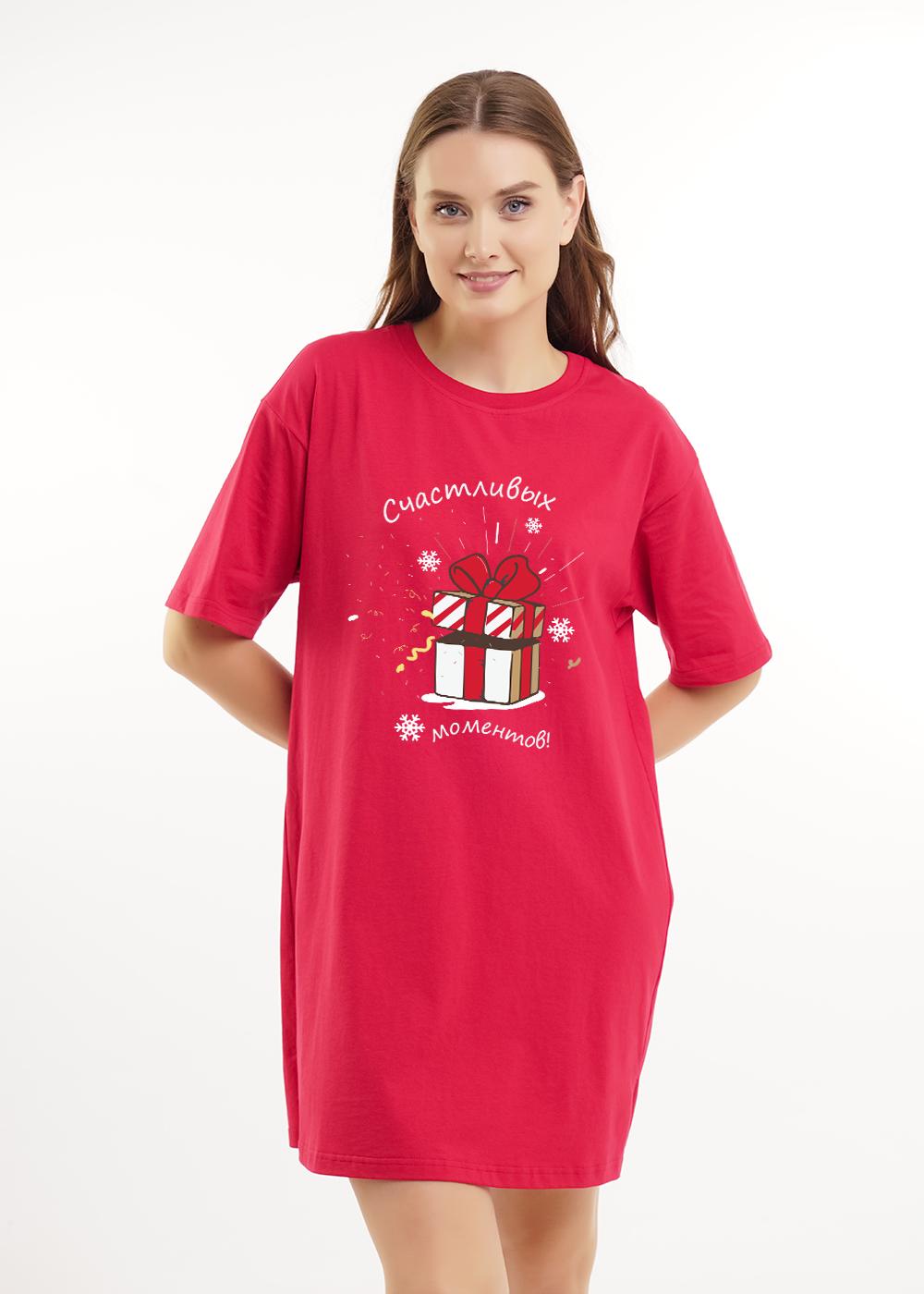 Платье для дома и отдыха из хлопкового трикотажного полотна прямого кроя, длиной до колена. Короткий втачной рукав. Округлая горловина с обтачкой. По бокам разрезы. Спереди принт.