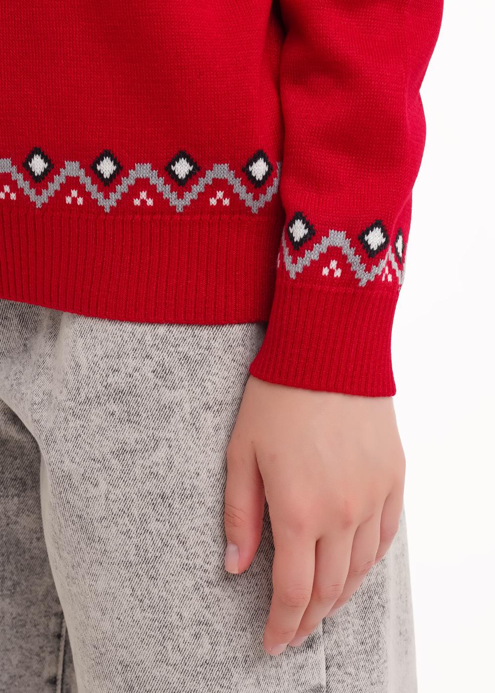 Вязаный джемпер прямого силуэта, жаккардового переплетения из акриловой пряжи. Втачной длинный рукав. По горловине полустойка. По низу изделия и рукавов манжеты.