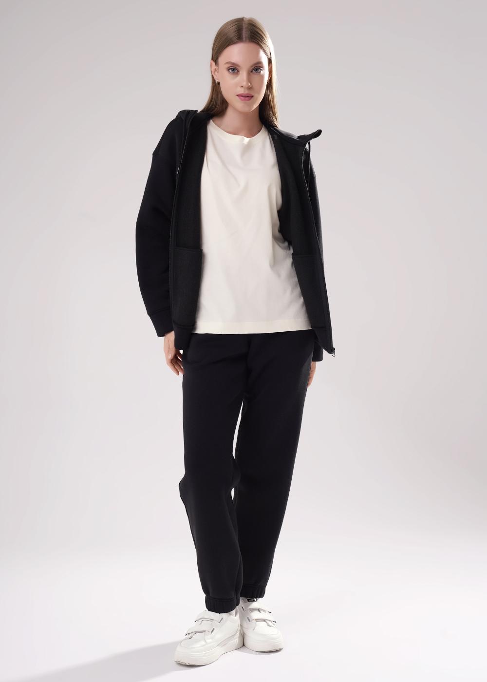 Куртка спортивная из трикотажного полотна футер с начесом, свободного кроя на молнии с капюшоном на подкладе и шнуром. Длинный рукав со спущенной линией плеча. По переду резы с карманами в швах. По низу рукава и изделия манжет. Спереди принт.